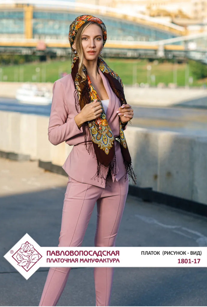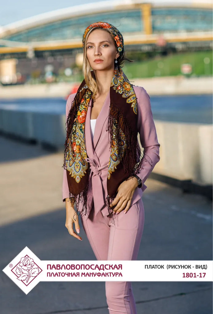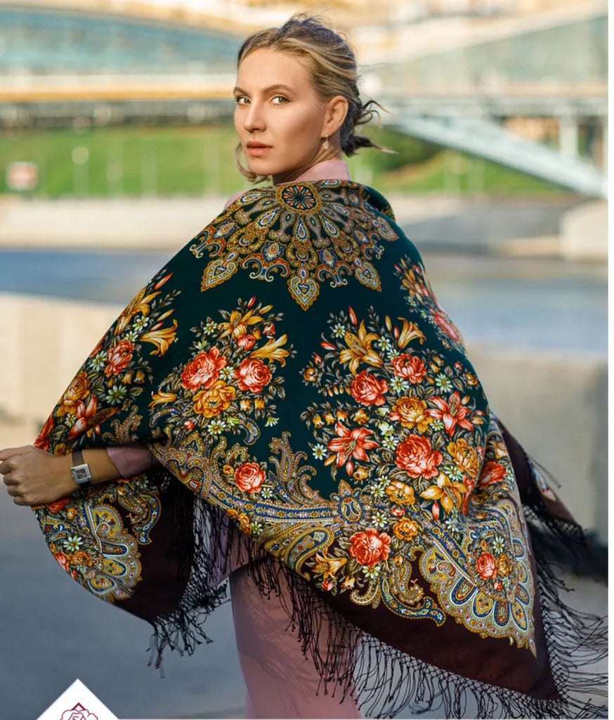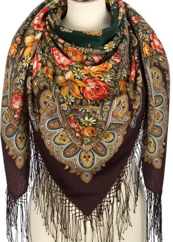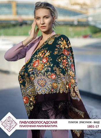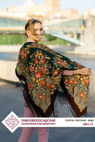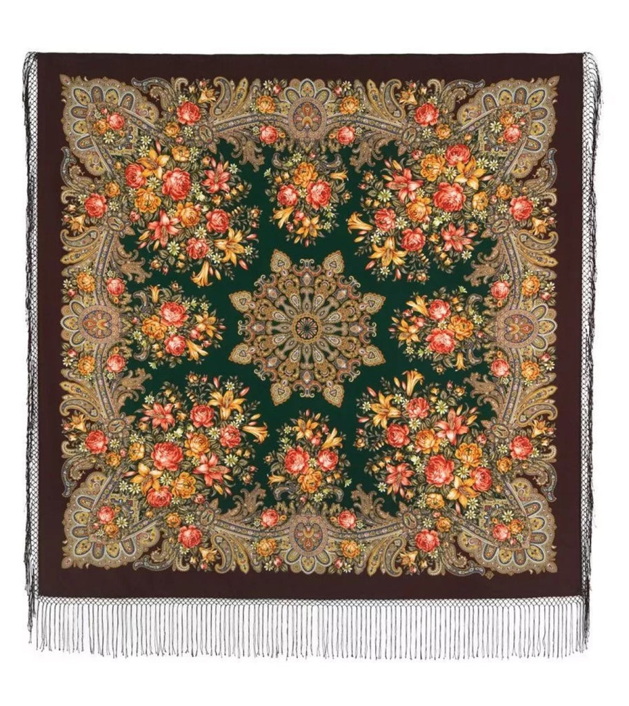 This 53'' square scarf is made of 100% merino wool by the Russian brand Pavlovo Posad. It features a beautiful design titled "Donskie Zori 1801-17" with a pattern inspired by nature, specifically leaves, flowers, and a color palette of green, brown, orange, and red. This versatile accessory can be styled as a shawl, neck warmer, dupatta, or hijab, making it suitable for all seasons. The garment care instructions recommend dry cleaning only to maintain its quality.