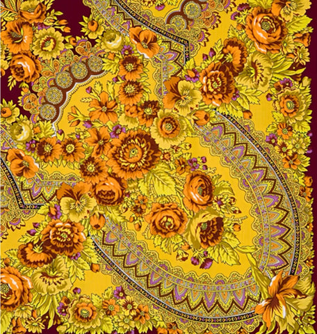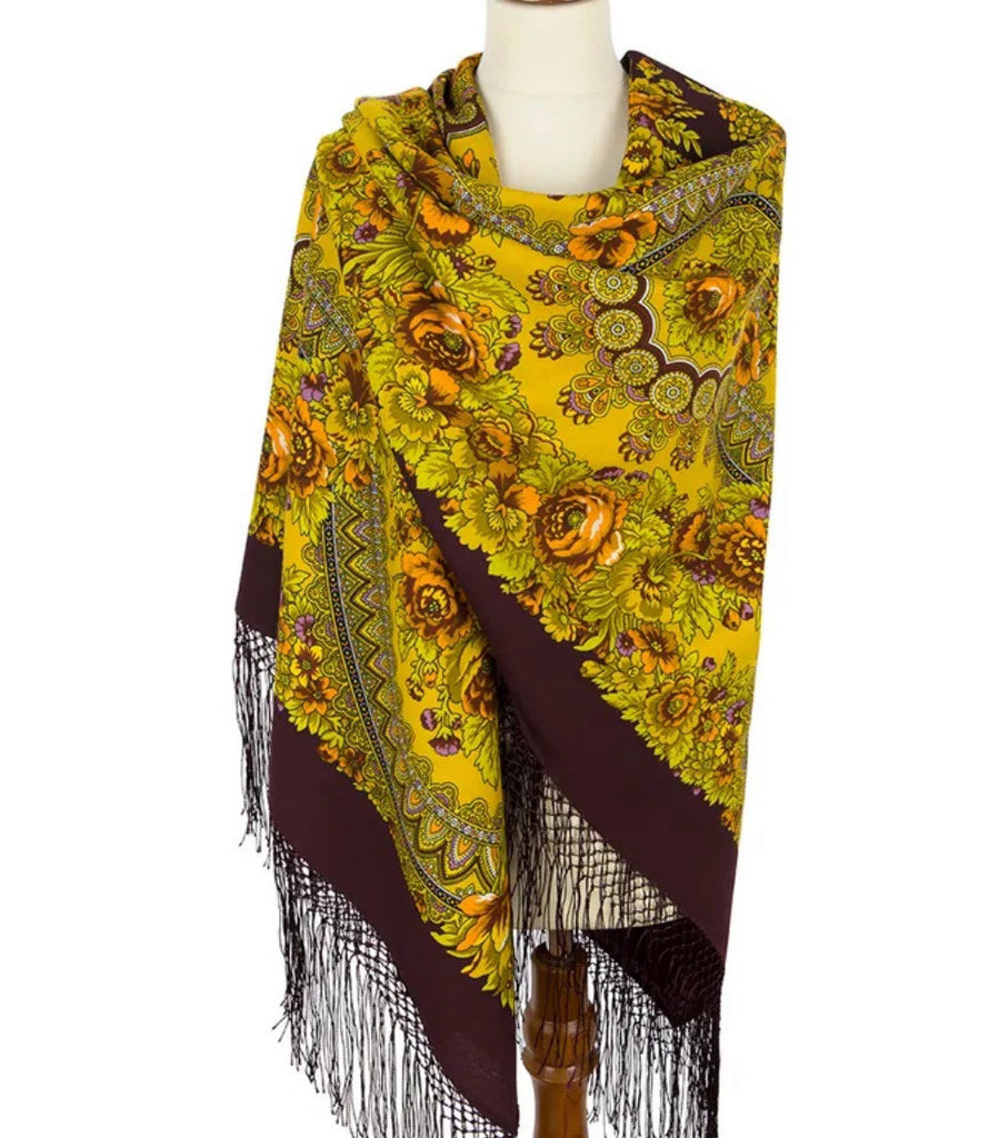 Wrap yourself in the warmth and elegance of the Pavlovo Posad Scarf, a versatile addition to any wardrobe. Crafted from 100% merino wool, this cozy scarf is a perfect accessory for year-round comfort. Its 58'' square design features a vibrant brown, yellow, and orange floral pattern, infusing nature's beauty into your daily ensemble.