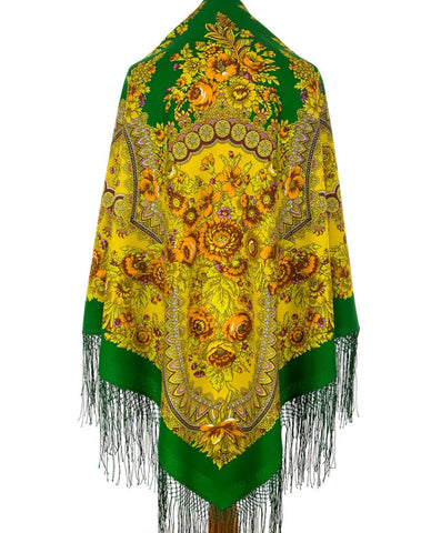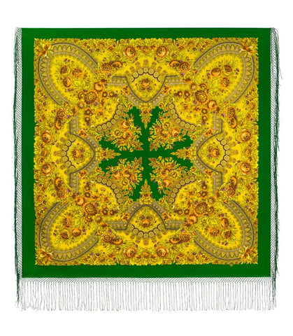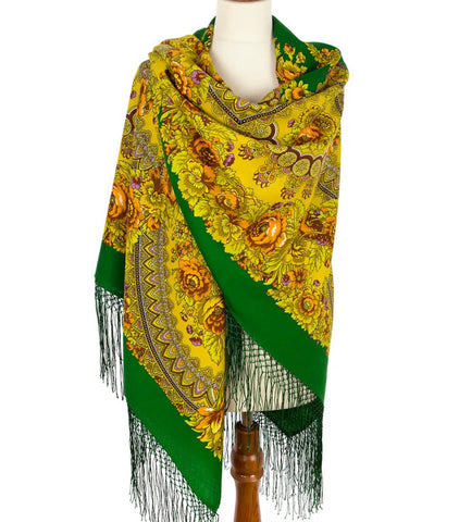 Scarf 58'' square 100 % merino wool green yellow cozy soft big Pavlovo Posad 377