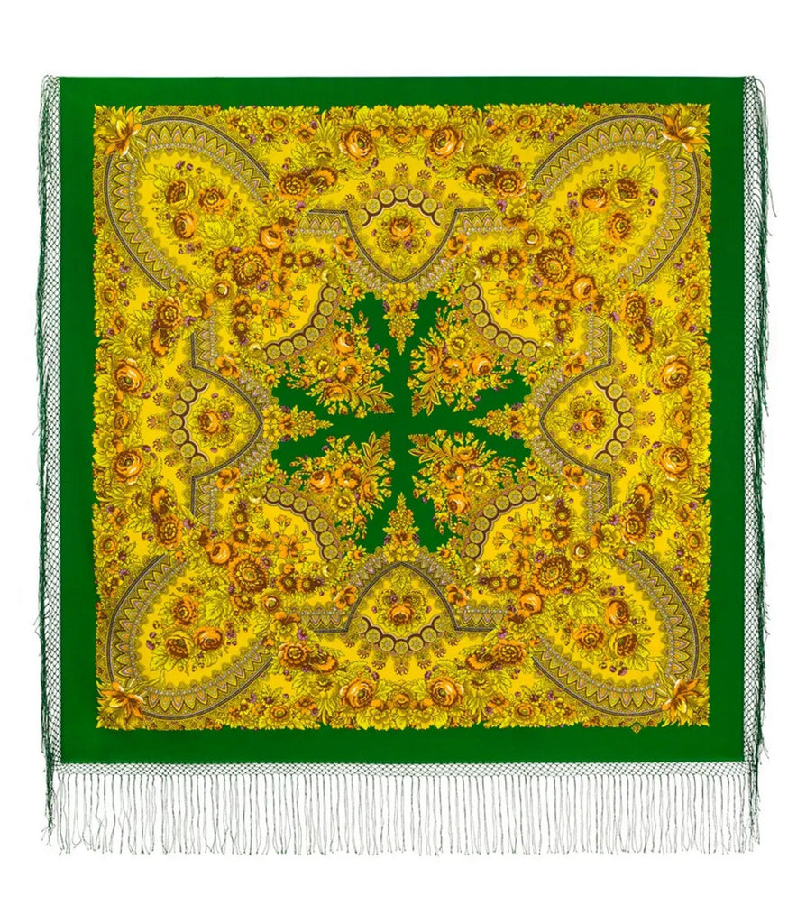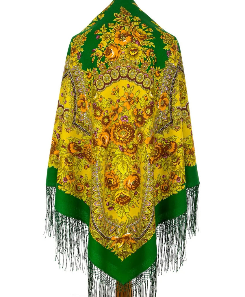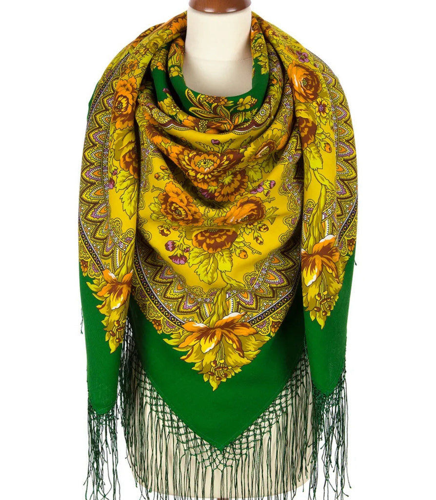 Wrap yourself in the warmth and elegance of this Pavlovo Posad Scarf, featuring a vibrant blend of orange, green, and yellow hues. The luxurious 100% merino wool fabric ensures comfort and durability, making it an essential accessory for any season. Its generous 58-inch square dimensions provide ample coverage and versatility in styling. Adorned with a charming floral pattern that captures the essence of nature, this Russian traditional scarf is accentuated with a sophisticated fringe, adding a touch of sophistication to its casual charm. Whether you're looking to accessorize for a chilly evening or a cool morning, this multifunctional piece can serve as a neck warmer, scarf, shawl, or stole, elevating your ensemble with its cozy and stylish appeal.