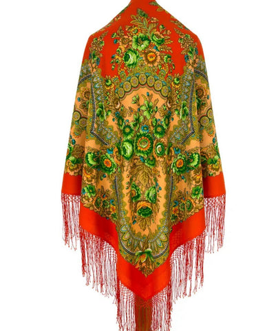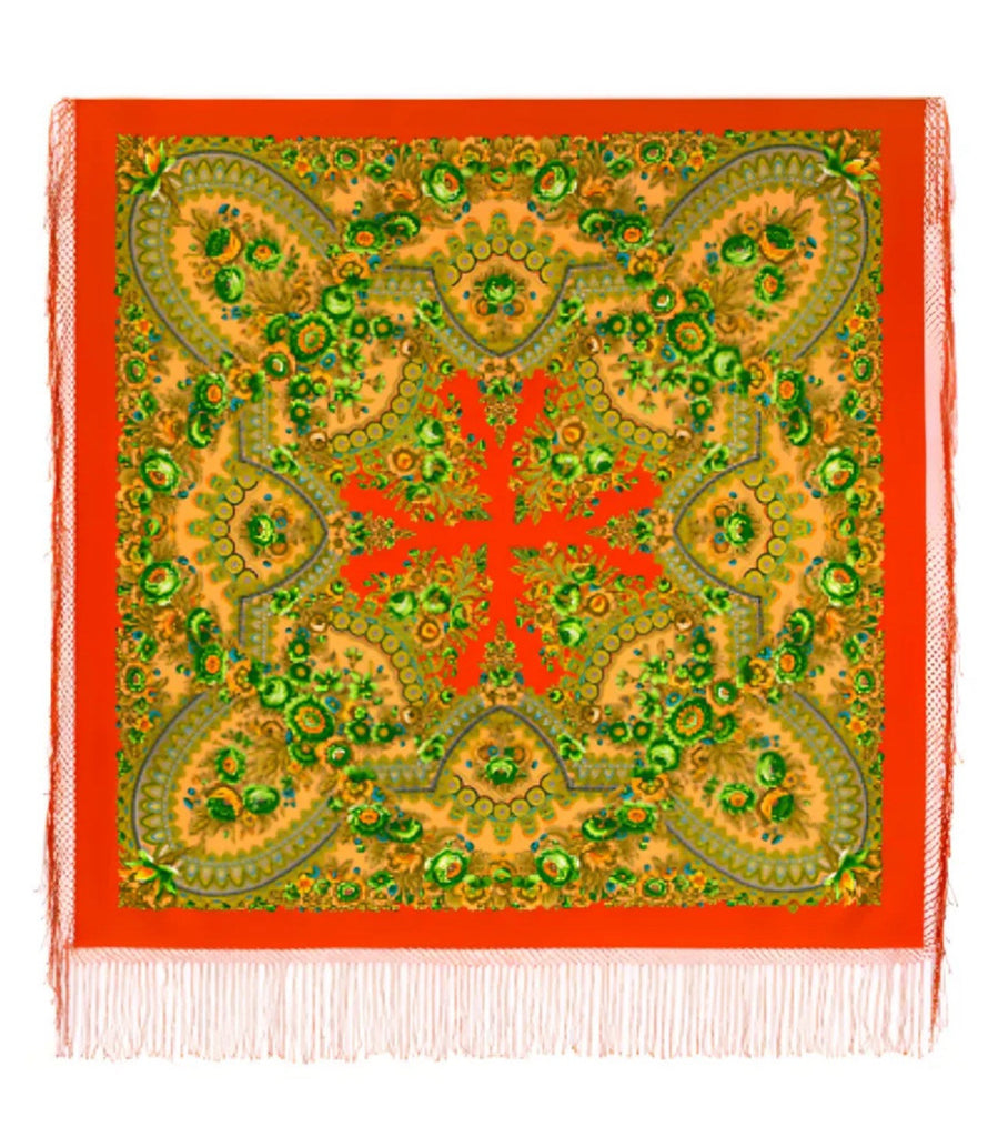 Wrap yourself in the warmth and elegance of this Pavlovo Posad Scarf, featuring a vibrant blend of orange, green, and yellow hues. The luxurious 100% merino wool fabric ensures comfort and durability, making it an essential accessory for any season. Its generous 58-inch square dimensions provide ample coverage and versatility in styling.