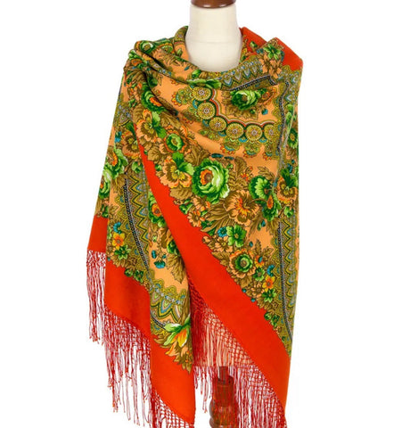 Adorned with a charming floral pattern that captures the essence of nature, this Russian traditional scarf is accentuated with a sophisticated fringe, adding a touch of sophistication to its casual charm. Whether you're looking to accessorize for a chilly evening or a cool morning, this multifunctional piece can serve as a neck warmer, scarf, shawl, or stole, elevating your ensemble with its cozy and stylish appeal.