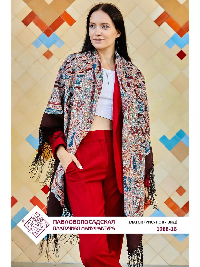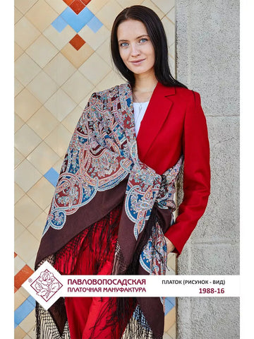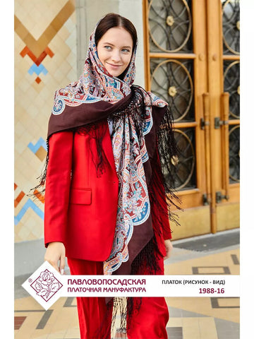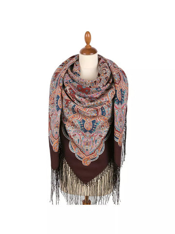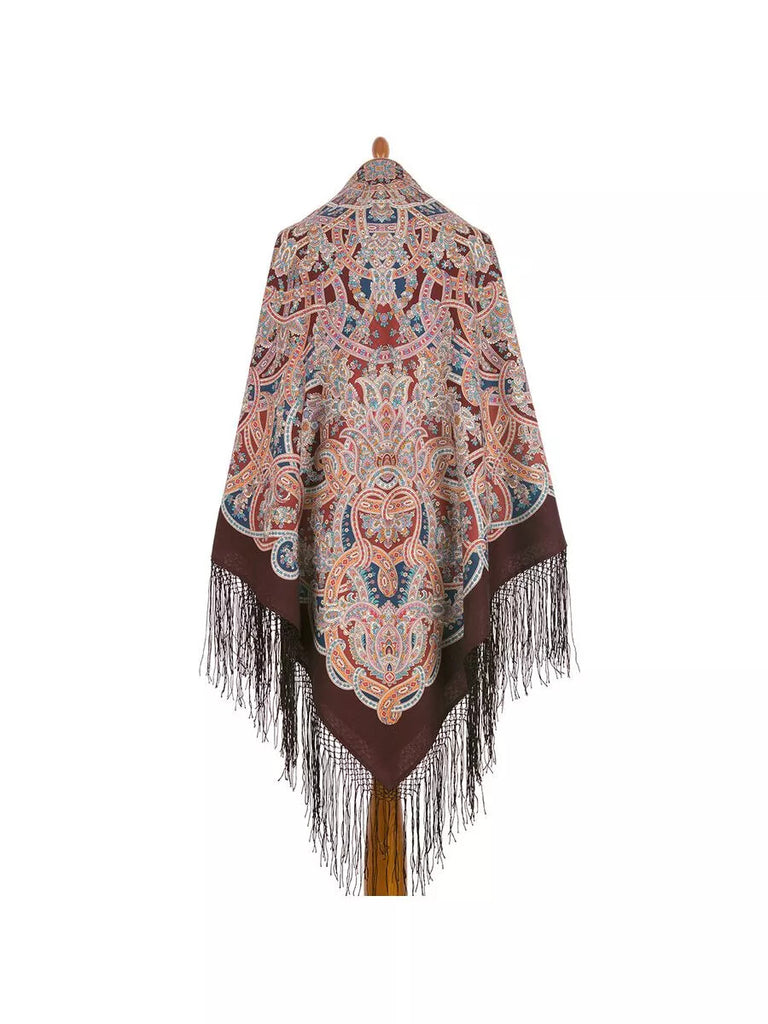 A 58-inch, 100% merino wool shawl featuring vibrant colors in a traditional Russian design. Showcasing an intricate herbal-inspired pattern in rich brown, accented with teal and white, this shawl exudes elegance and cultural charm. Soft, warm, and lightweight, it is finished with delicate silk fringes, adding a touch of refinement. Perfect for making a bold yet timeless statement, it blends heritage craftsmanship with contemporary sophistication, making it a versatile and luxurious accessory for any occasion.