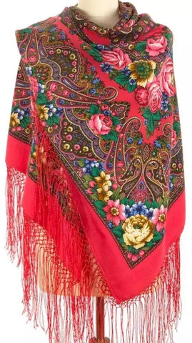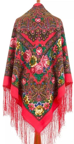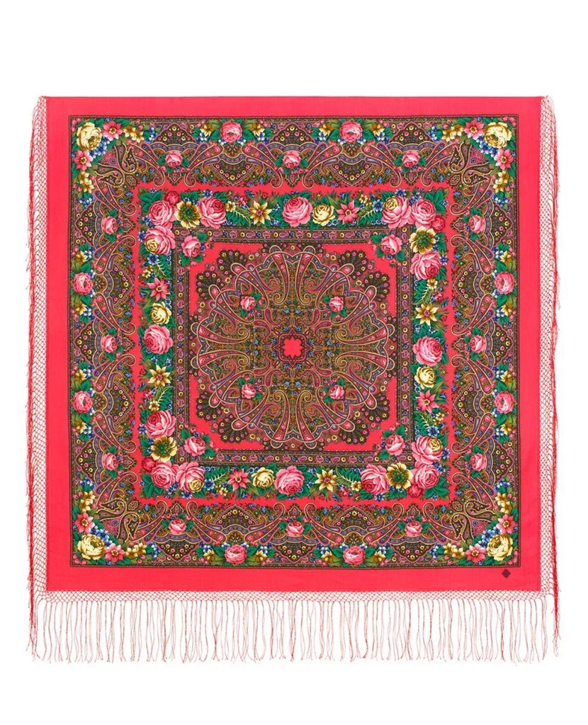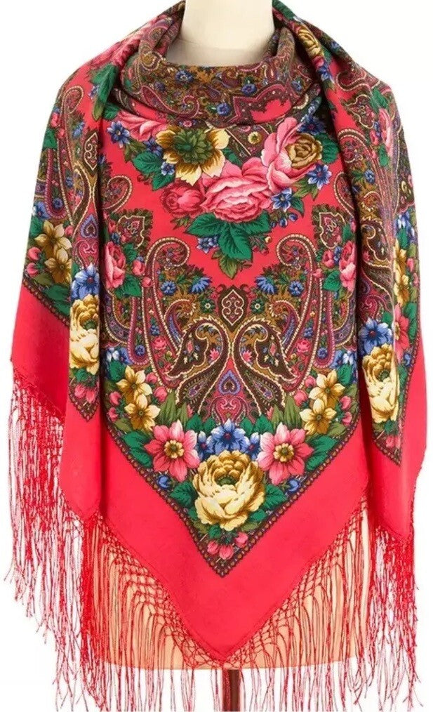 This square scarf, measuring 58 inches, is made of 100% Merino wool and features a bright pink color with floral patterns in green, blue, yellow, and brown. The scarf is from the brand Pavlovo Posad and is adorned with leaves and flowers, giving it a nature-inspired theme. This versatile accessory can be worn as a shawl, wrap, neck warmer, or traditional scarf, making it suitable for all seasons. It is recommended to dry clean only to maintain its quality.