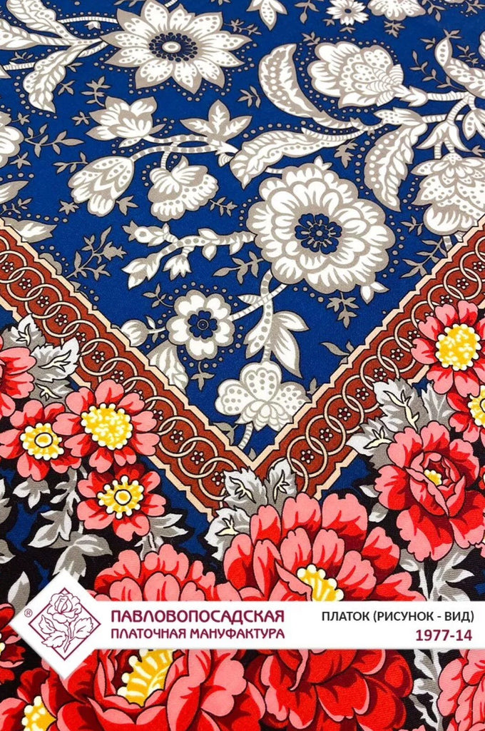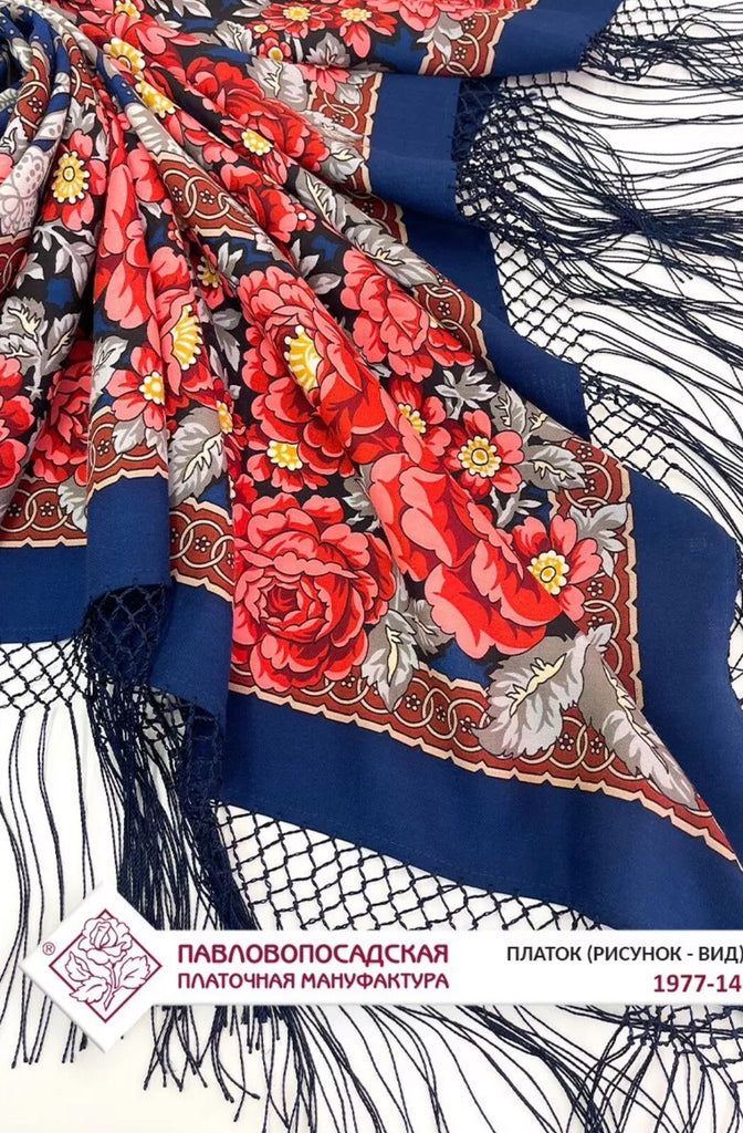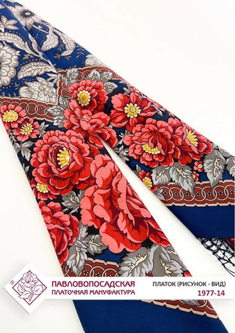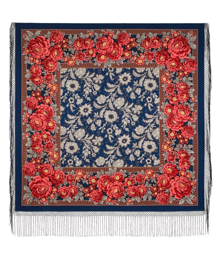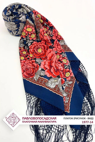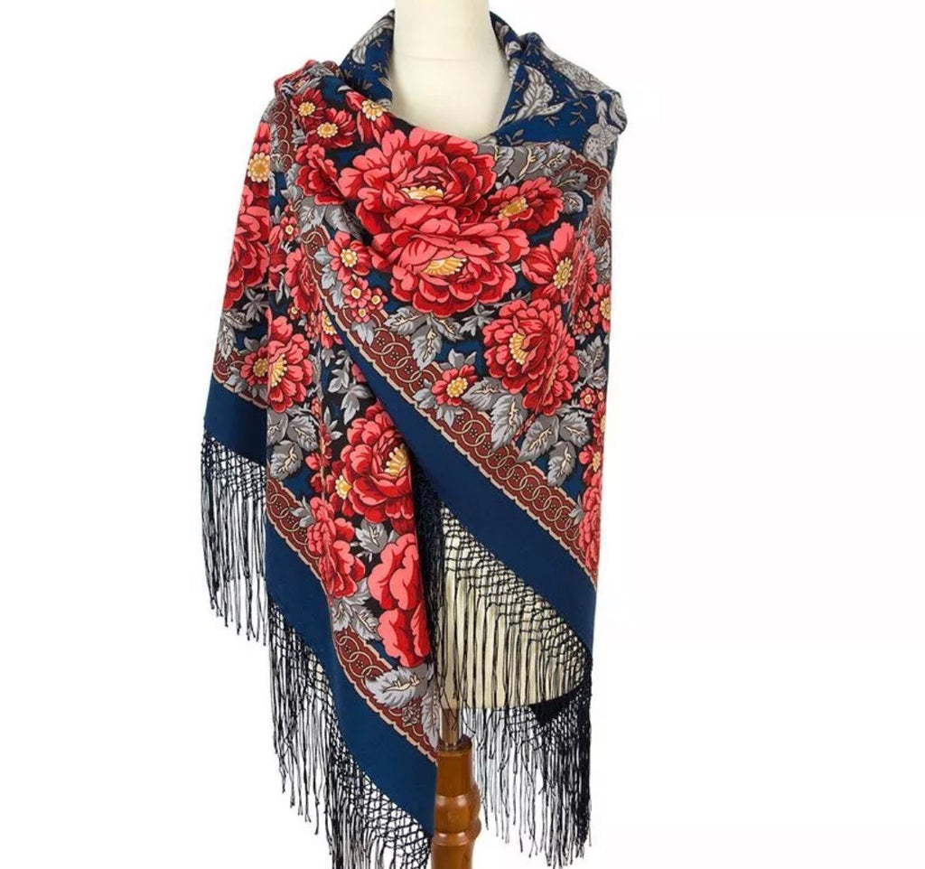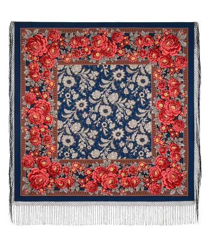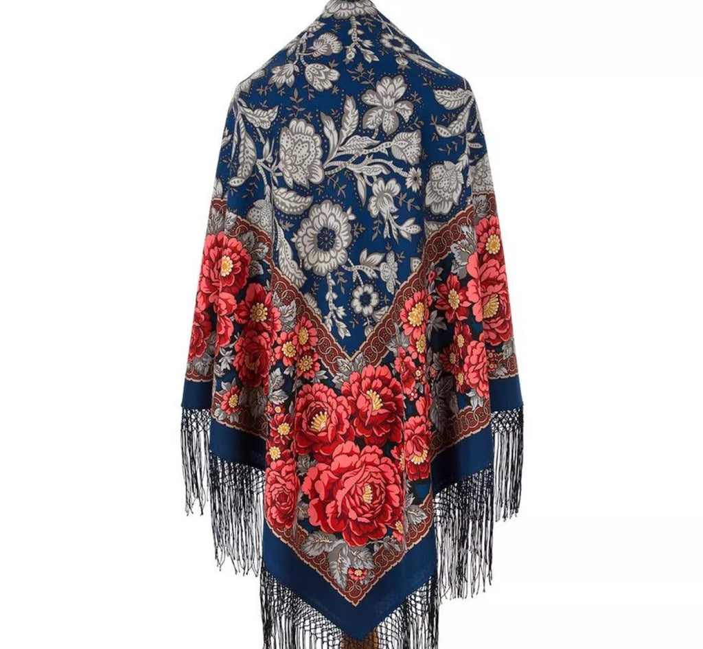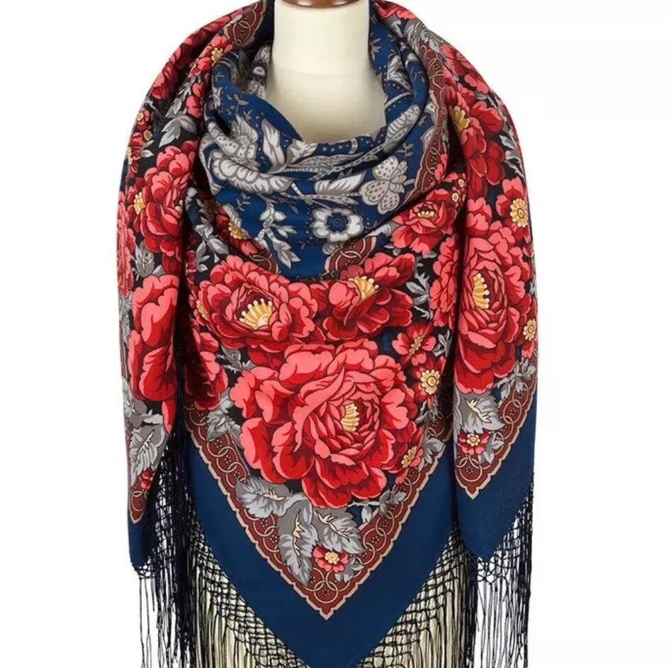 This Pavlovo Posad scarf is a 58'' square made of 100% natural merino wool in a blue and red color combination. The scarf features a floral pattern with leaves and flowers, fitting the nature theme. It is designed for women and can be used as a big stole, making it a versatile accessory suitable for all seasons, especially winter. This large shawl is a stylish and cozy addition to any outfit.