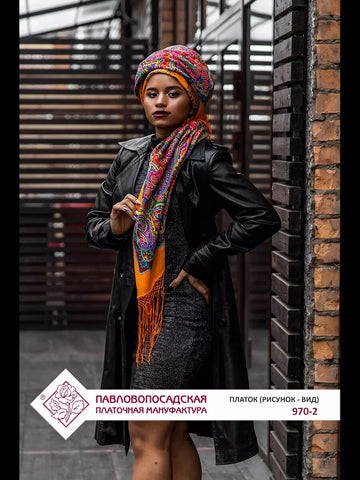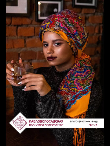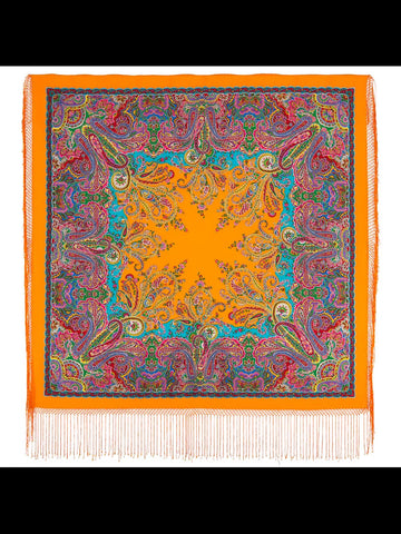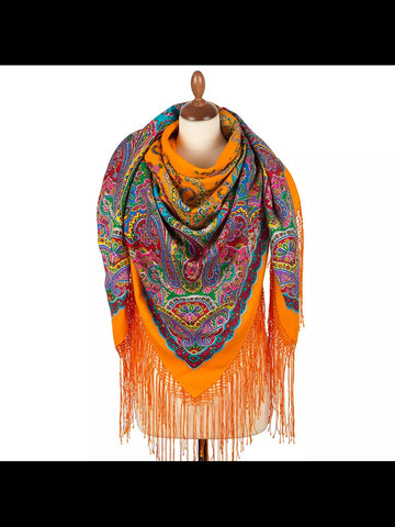 A luxurious 100% merino wool scarf showcasing a stunning ethnic design. Adorned with a vibrant floral ornament, it features a rich and dynamic color palette of orange, red, purple, turquoise, and green. Soft, warm, and lightweight, this exquisite scarf drapes beautifully, enhanced by delicate silk fringes that add an extra touch of elegance. Perfect for cooler days, it blends heritage charm with contemporary style, making it a timeless accessory for any wardrobe.