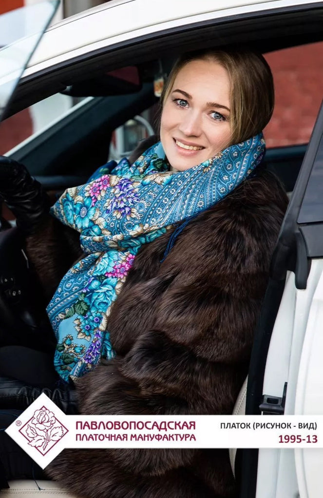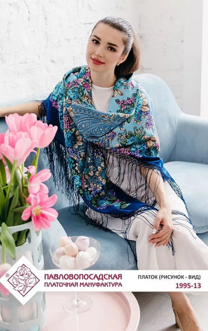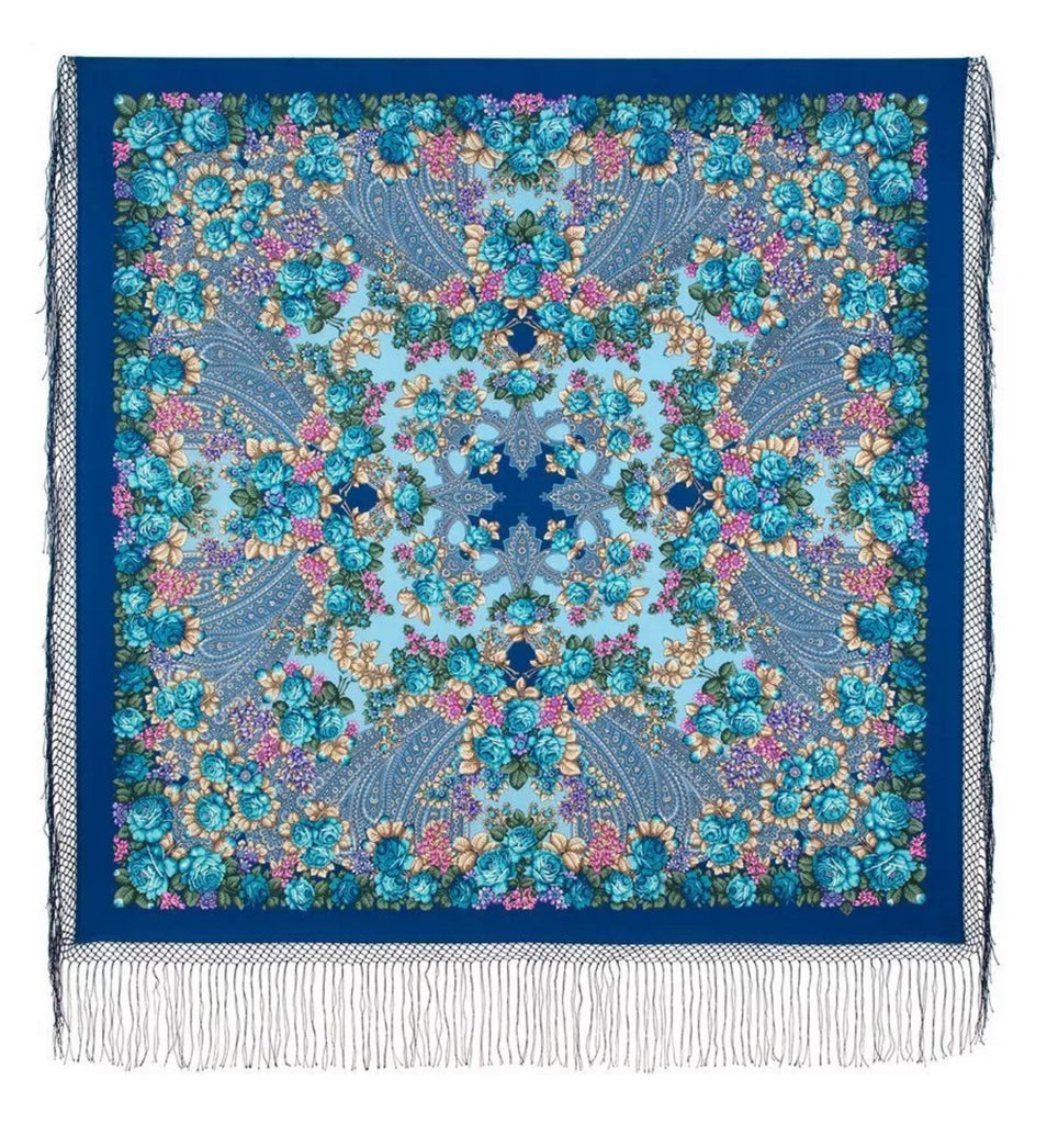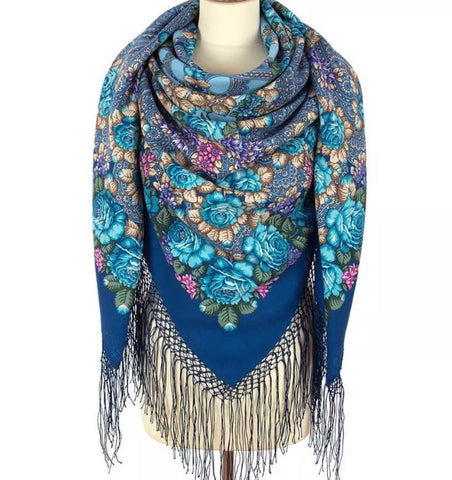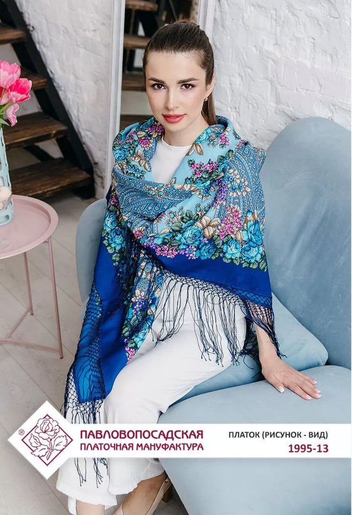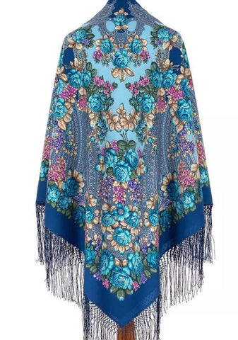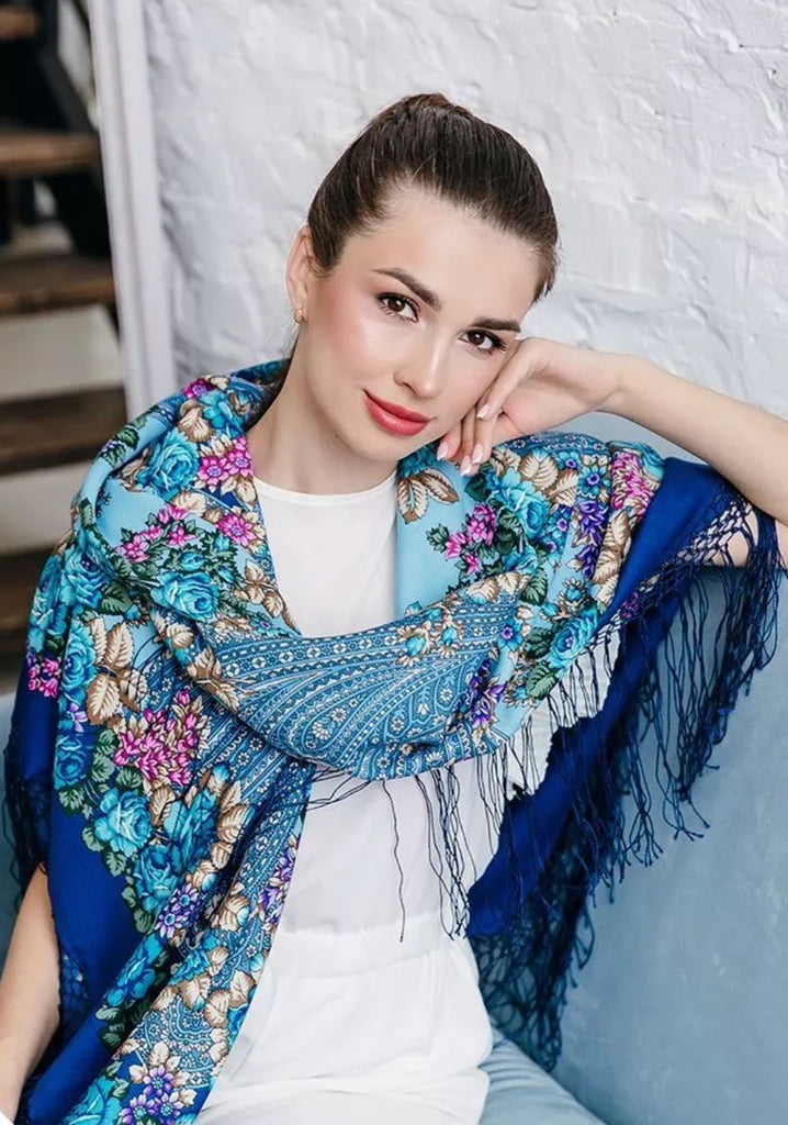 A luxurious 100% merino wool scarf showcasing a stunning ethnic design. Adorned with a vibrant blue and white floral ornament, it features a rich traditional folk Russian "babushka" style. Soft, warm, and lightweight, this exquisite scarf-palantine drapes beautifully, adding a touch of cultural elegance to any outfit. Perfect for cooler days, it blends heritage charm with contemporary style, making it a timeless accessory for any wardrobe.