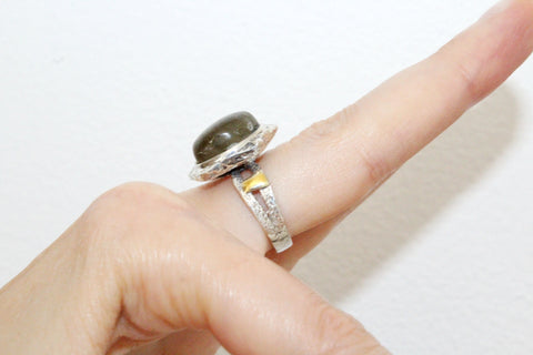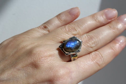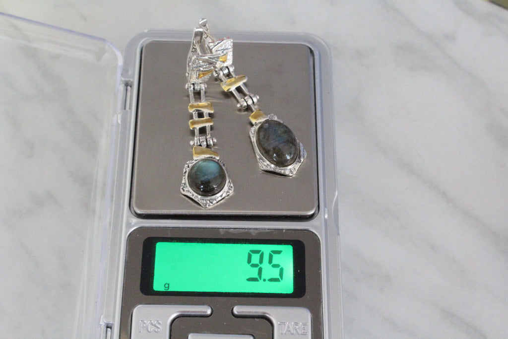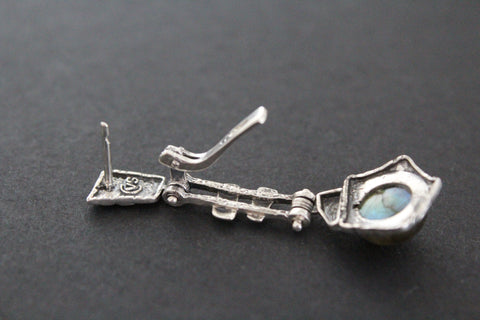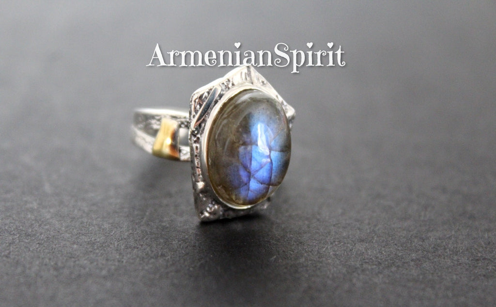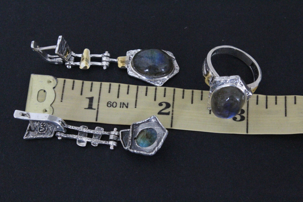 Are you searching for a sterling silver set with labradorite gemstones for women? Please check these earrings and ring made of silver 925 and cabochon blue labrador. The stone`s color change from gray to blue under different lighting. The earrings have unusual design. The stones of earrings have different sizes. It is an design idea of artisan.