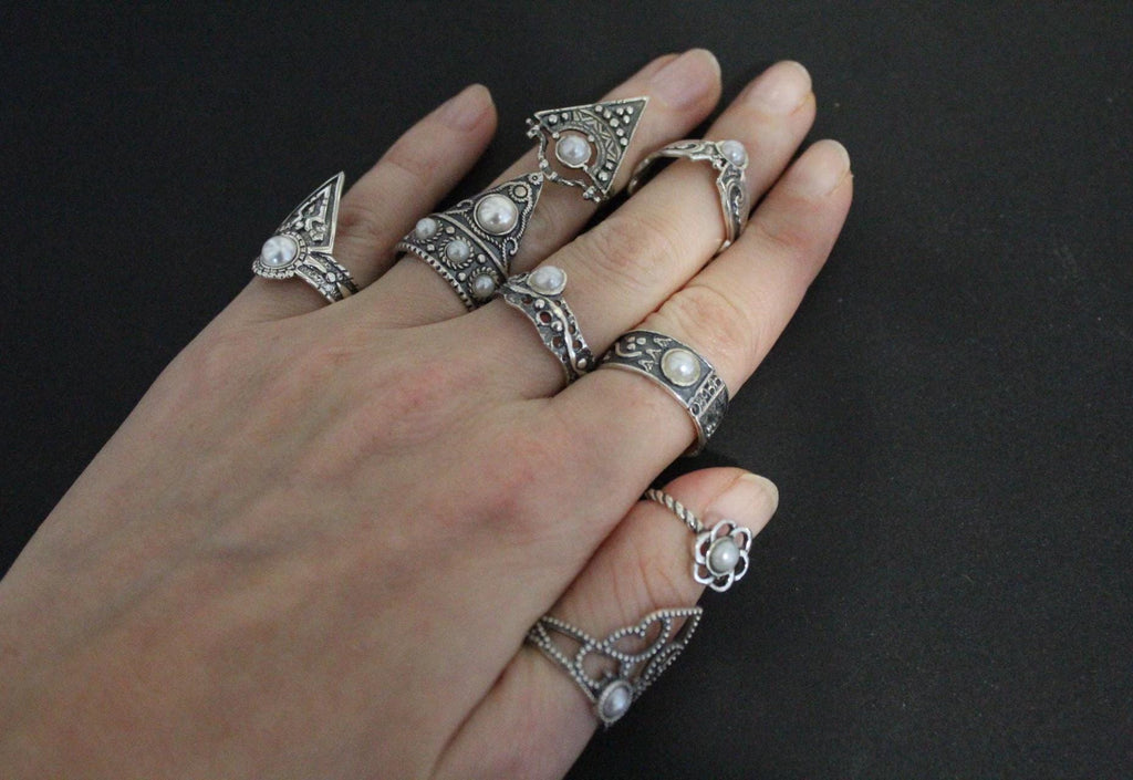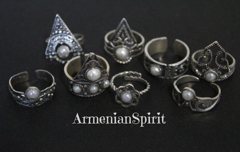 Discover the rich history of Armenian culture with our Set of 8 Sterling Silver Rings. Each ring is handcrafted with intricate ethnic designs and features adjustable sizing for the perfect fit. Adorned with artificial white pearl stones, these rings add a touch of elegance to any outfit. Embrace your heritage with these unique and timeless pieces.