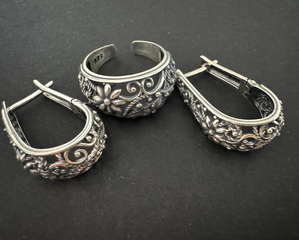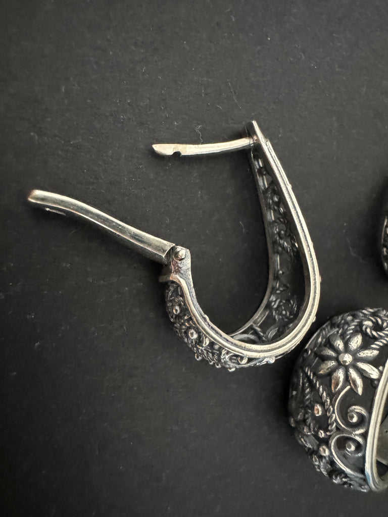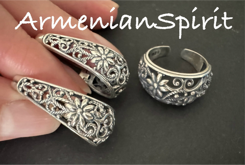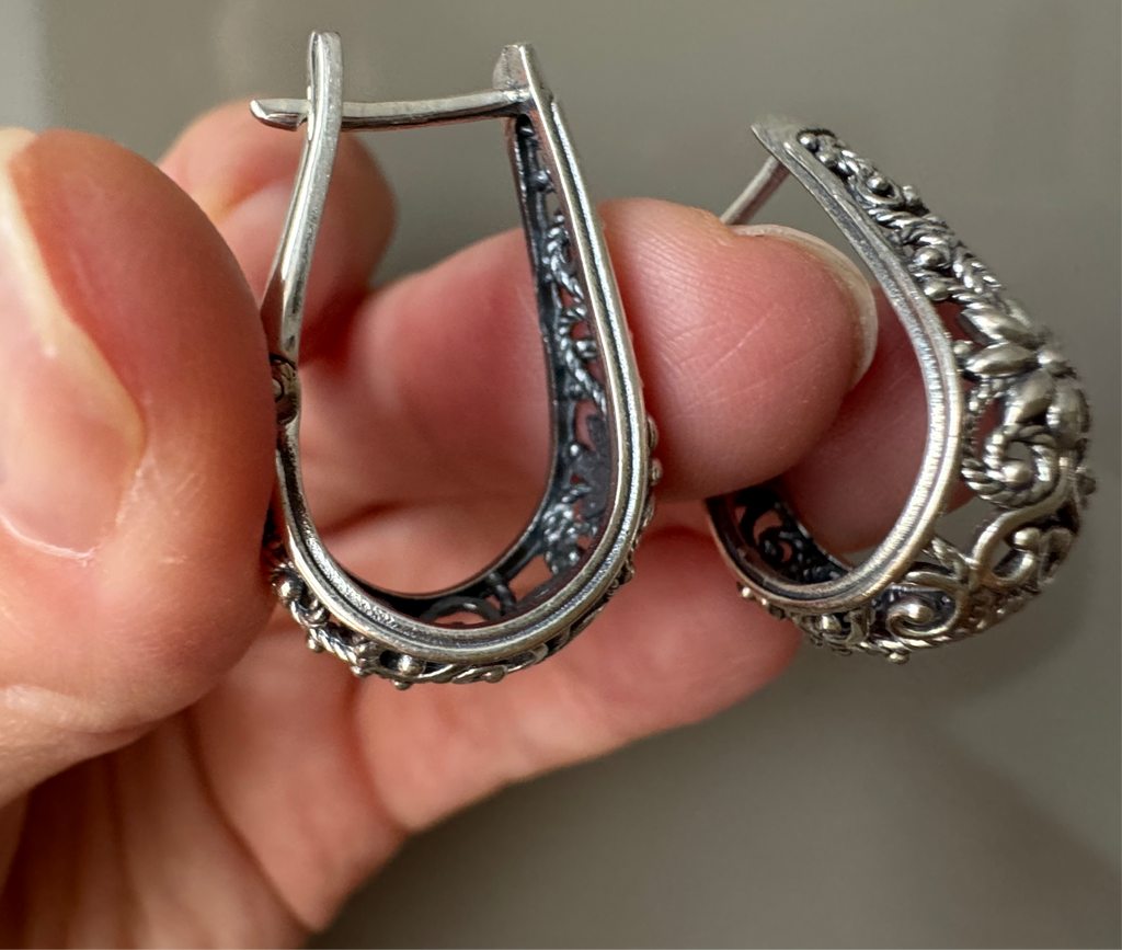 We make the jewelry of Sterling silver 925, which has very high quality. But please, note that silver always changes the color and becomes darker, because of several reasons: air humidity, using soap, skin contact and others. You can easily clean it with usual wet baking soda and wash with cold water. The jewelry will shine again!
