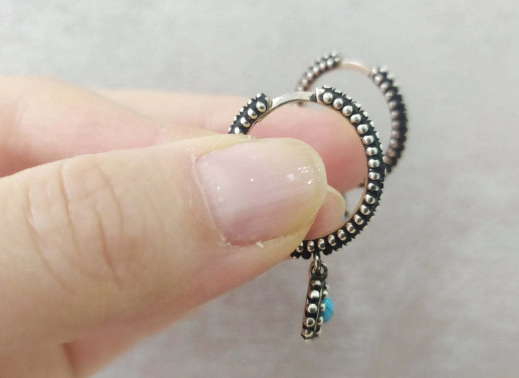 Experience the beauty and tradition of Armenia with our set ring and hoop earrings. Made from black oxidized silver, these earrings and ring feature natural turquoise gems and showcase an Armenian traditional style. Expertly crafted with 925 silver, this jewelry set offer a unique and elegant touch to any outfit.