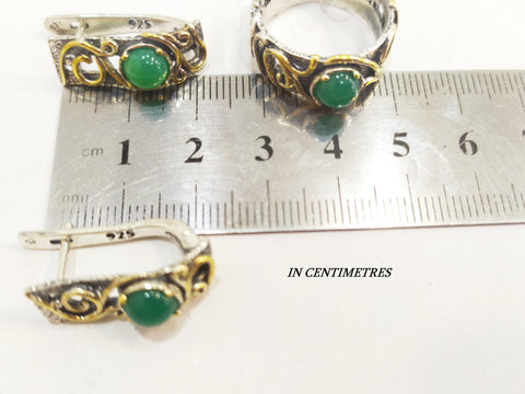 Enhance your everyday look with the elegance of Armenian Spirit's SET of sterling silver jewelry. The delicate earrings and ring feature a natural green jadeite gemstone, set in silver with gold plated details, perfect for any occasion. Elevate your style with the best gifts from Etsy's high quality selection. Welcome to the Armenian Spirit Etsy store where you can buy beautiful jewelry that is gentle on even the most sensitive skin. We offer worldwide shipping with tracking and discounts to ensure your satisfaction. Say goodbye to irritation with our carefully crafted pieces.