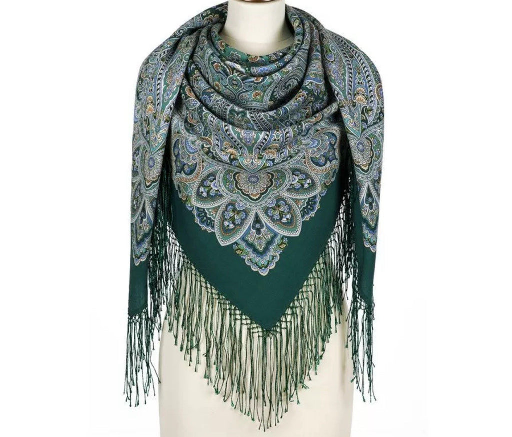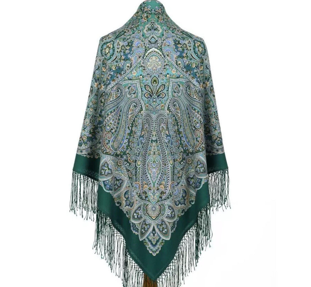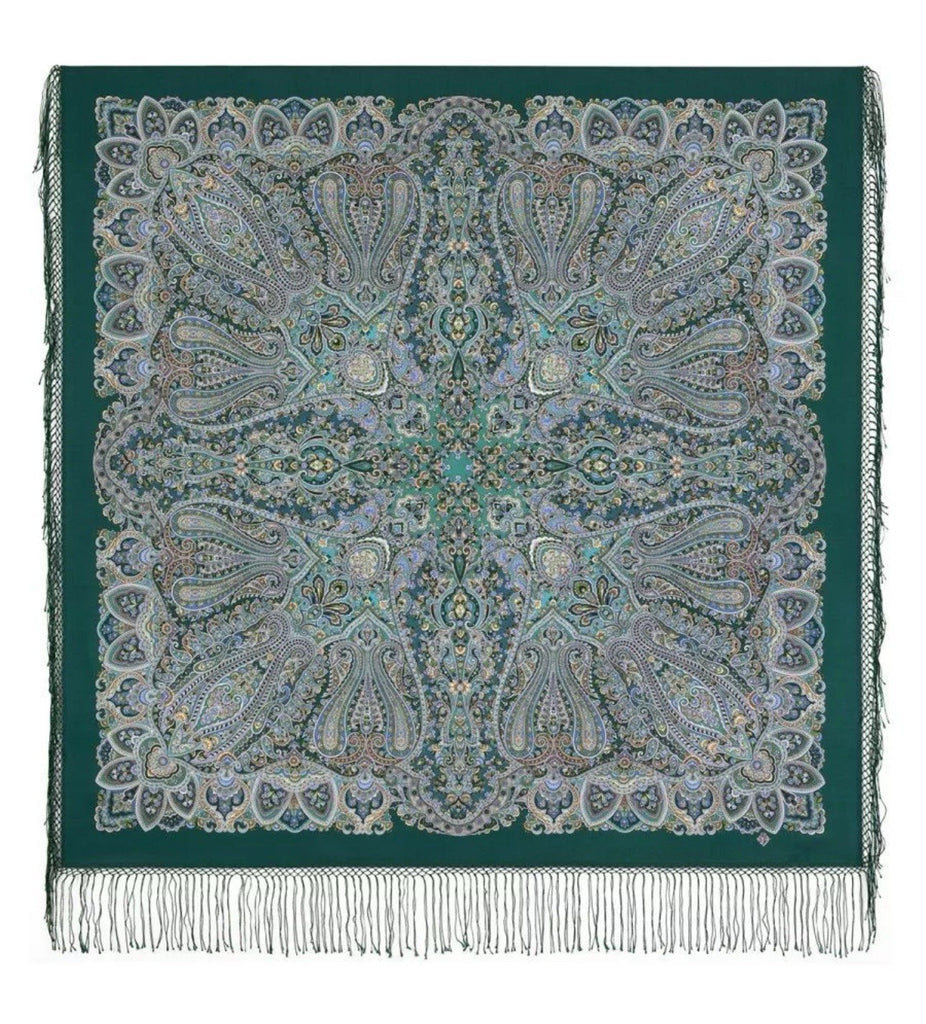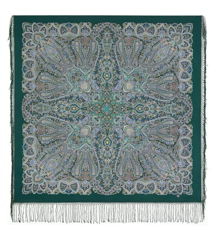 Wrap yourself in the timeless elegance of the Pavlovo Posad Shawl, a piece that effortlessly combines classic design with modern versatility. The shawl features a lush tapestry of floral and leaf motifs, hues of green, turquoise, light blue, and beige, and made of 100% Merino wool. Its square shape and fringe accents provide a cozy feel and versatile styling options.