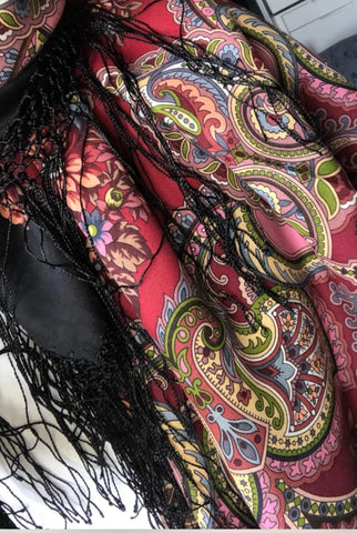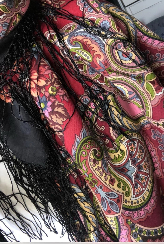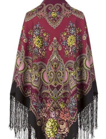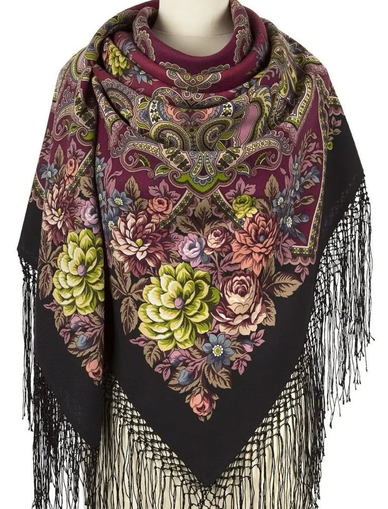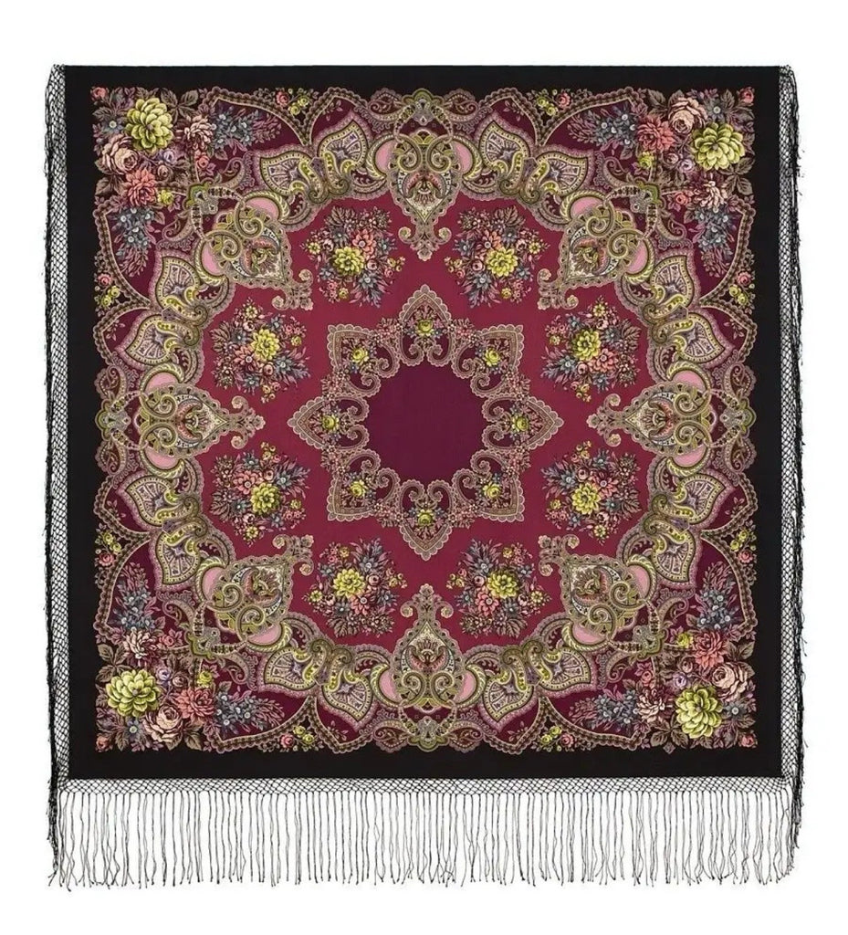 This feminine shawl is a 58'' square made of merino wool by the brand Pavlovo Posad. It features a bright floral pattern with leaves and flowers in burgundy red, red, and salad green colors. The scarf has silky fringe accents and can be styled as a shawl, wrap, neck warmer, or stole, making it multifunctional for different occasions. Made in the Russian Federation, this scarf is perfect for all seasons, including winter, summer, fall, and spring, adding a touch of Slavic-inspired elegance to any outfit.