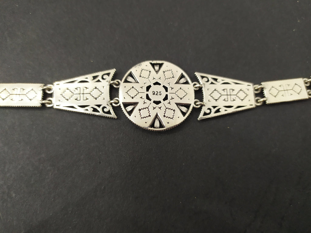 This Silver 925 bracelet in ethnic style is a stunning piece of handmade Armenian jewelry. Adorned with a black onyx round detail, it perfectly complements traditional taraz outfits. Made by a trusted Armenian store, this bracelet is a beautiful and authentic addition to any jewelry collection.