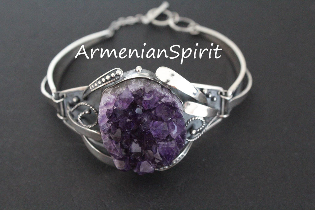 Experience the ultimate in exquisite jewelry with this handmade Silver 925 Set bracelet. The large druse geode gemstone in mesmerizing amethyst purple adds a touch of elegance and flair. With intricate filigree detailing, this vintage inspired bracelet is perfect for any occasion. Shop now on Armenian Spirit and elevate your style. Indulge in your jewelry addiction with the best online shopping experience at Armenian Spirit! Our high-quality pieces and exceptional customer service will leave you coming back for more. Don't miss out on the best jewelry store - shop now and treat yourself from Armenian Spirit!
