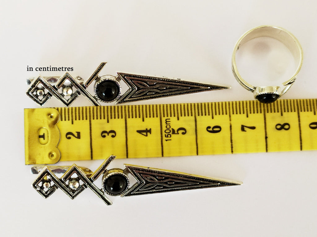 Discover the rich cultural heritage and timeless beauty of Armenian jewelry with this set. The Silver 925 earrings and adjustable ring feature stunning black onyx stones, showcasing a centuries-old history and cultural identity. Elevate your style with a touch of gothic elegance. Purchase from our best jewellery store today and add a unique piece to your jewelry collection.