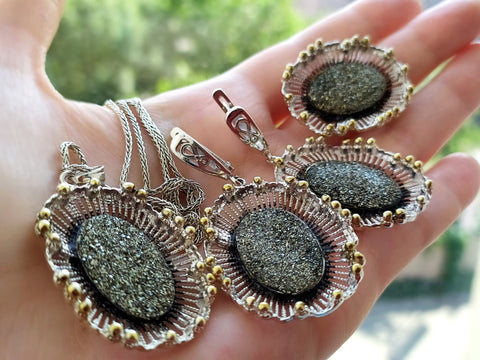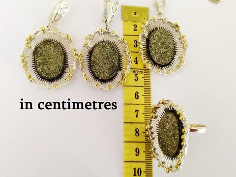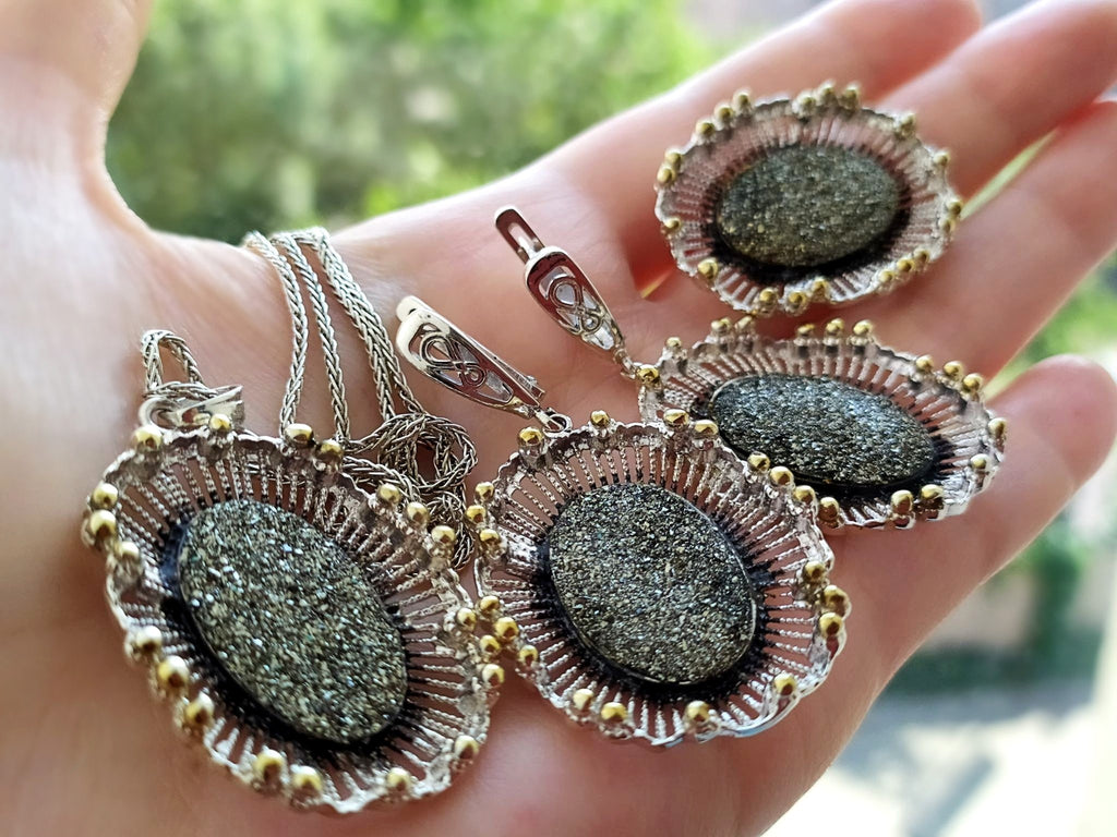 Beautiful ring made of 925 sterling silver with gold plated details and natural druse pyrite. The ring is made in the form of a large flower and shines with golden glitter. This will be a luxurious gift for your beloved wife or bride. A woman of any age will be happy to receive such a gift as a gift. Pyrite is a golden yellow mineral with a strong metallic luster. Pyrite stone is a mineral of the fire element, which fills the owner with large reserves of vital energy. Pyrites are closely related to the sign of Aries. This natural crystal is suitable for the owners of the signs of Scorpio, Sagittarius, Virgo. Pyrite - "pyrites lithos" - a stone that strikes fire. This is an excellent energy shield: it blocks negative energy.