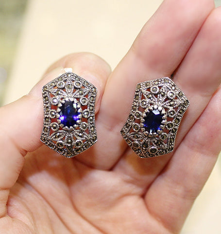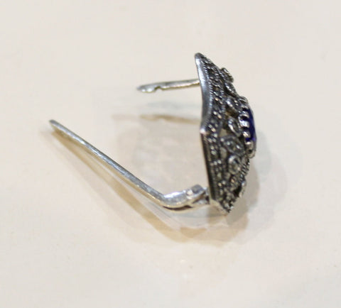 Introducing our handmade silver marcasite earrings crafted with epochal design. Made with premium silver 925, these earrings feature stunning blue stones for a touch of elegance. Enhance your outfit with these unique Armenian jewelry pieces and make a statement with timeless beauty. Embrace timeless elegance with our Marcasite earrings in silver, inspired by the Victorian era. Available in a variety of colors such as RED, BLUE, BLACK, BROWN, GREEN, and PINK.