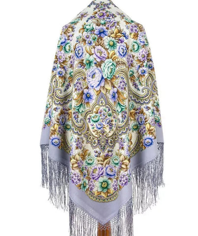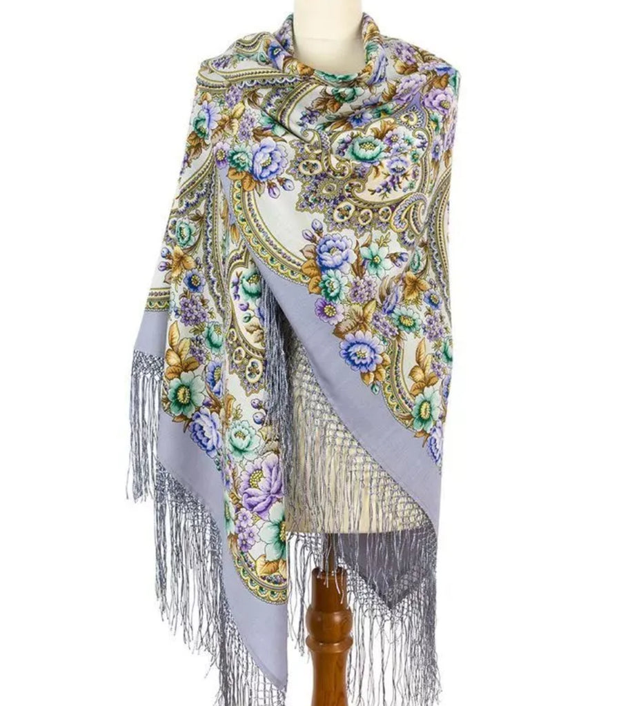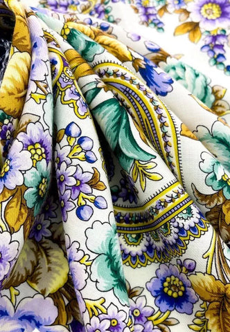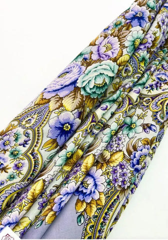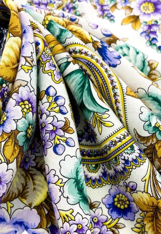 Discover timeless elegance with this gorgeous 58" square merino wool scarf in purple, your new favorite companion through not warm spring strolls, chilly summer nights, windy fall walks, and cold winter adventures. Soft as a dream with zero prickles and no irritations, this hypoallergenic beauty is a dream for sensitive skin. The warm and cozy embrace of premium merino keeps you snug without the scratch, while the vibrant red and yellow ethnic floral pattern brings vintage-inspired flair to every outfit. Perfect gift ideas for loved ones or a treat-yourself moment—find this showstopper at our online shop and wrap yourself in comfort and style all year long.