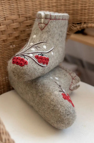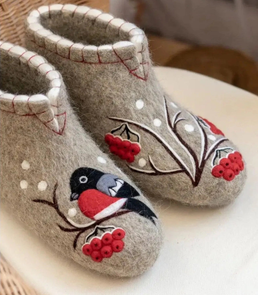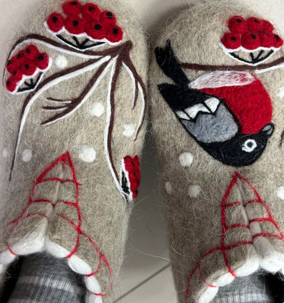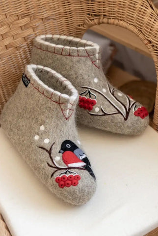 These slippers are made from 100% natural wool felt, featuring a gray color with embroidered bullfinch and red rowan pattern. Handmade in the Russian Federation by Nashi Valenki, they are designed for women in UK size 7, US size 9, and EU size 40. Perfect for winter, fall, summer and spring seasons, these cozy house shoes boast a nature-themed style with accents of red bullfinch and rowan embroidery, ideal for those who appreciate natural materials and artisan craftsmanship. Stay warm and