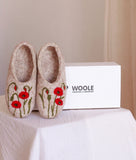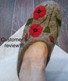 These authentic sheep wool slippers, also known as Russian valenki, are designed with a round toe shape and slip-on design for easy wear. Handmade in the Russian Federation, they feature embroidered poppy flowers in shades green and red, adding a charming touch to the design. The wool lining and insole provide warmth and comfort, while the natural suede outsole ensures durability. With a focus on nature and traditional craftsmanship, these gray slippers are a cozy and stylish choice for indoor wear in any season. These felted slippers provide dry warmth that no other shoe can provide: they are not hot in summer and not cold in winter. This is an excellent option for both a city apartment and a private house. These comfortable house shoes will be a wonderful gift for any occasion.