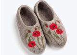 These authentic sheep wool slippers, also known as Russian valenki, are designed with a round toe shape and slip-on design for easy wear. Handmade in the Russian Federation, they feature embroidered poppy flowers in shades green and red, adding a charming touch to the design. The wool lining and insole provide warmth and comfort, while the natural suede outsole ensures durability. With a focus on nature and traditional craftsmanship, these gray slippers are a cozy and stylish choice for indoor wear in any season. These felted slippers provide dry warmth that no other shoe can provide: they are not hot in summer and not cold in winter. This is an excellent option for both a city apartment and a private house. These comfortable house shoes will be a wonderful gift for any occasion.