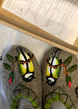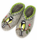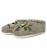 These are handmade slip-on slippers made from natural sheep wool felt, featuring embroidered sparrow bird designs. The wool fabric provides warmth and comfort, suitable for winter, fall, spring and even summer seasons. With a flat design, microporous rubber outsole, and a shaft height of 7.5 cm, these gray slippers are designed for casual wear. The slipper's wool lining and insole offer additional insulation, making them a cozy choice for indoor and outdoor use. Perfect for women who appreciate nature-inspired themes and natural materials, these Slavenki slippers have a slightly wider than average fitting for added comfort. These felted slippers provide dry warmth that