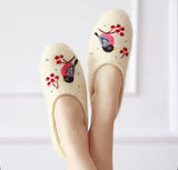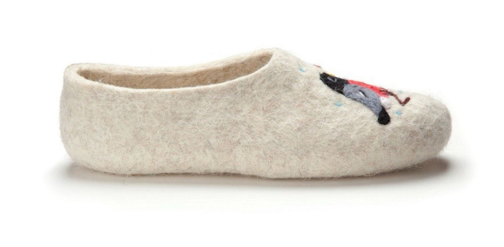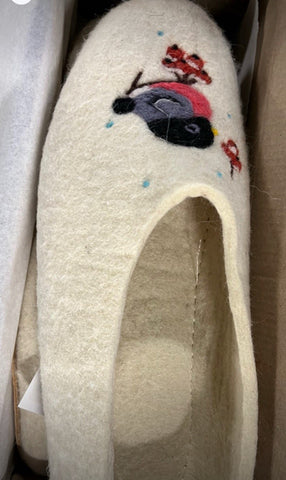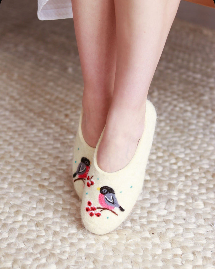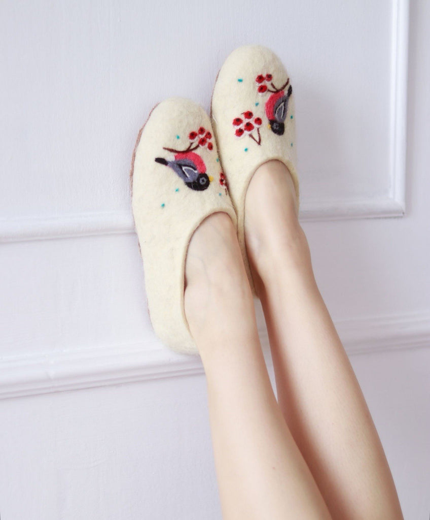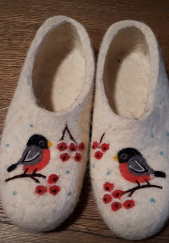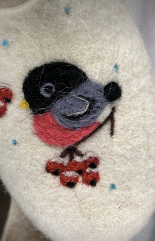 These authentic Sheep Wool Russian valenki slippers in size UK 6 (US 8) are warm indoor shoes perfect for all seasons. Featuring a round toe shape, slip-on design, and embroidered bullfinch and rowanberry pattern, these handmade cozy slippers offer medical benefits by soothing pain in muscles and joints and relieving nervous tension. Made with natural materials including wool lining and outsole, these slippers are accented with a bird theme, making them stylish and comfortable for casual wear. The neutral colors of milky white, black, gray, and red make them versatile for all seasons. These felted soft slippers provide dry warmth that no other shoe can provide: they are not hot in summer and not cold in winter. This is an excellent option for both a city apartment and a private house. These comfortable house shoes will be a wonderful gift for any occasion.
