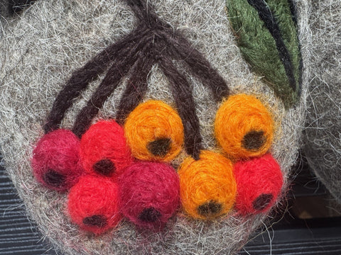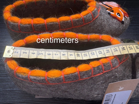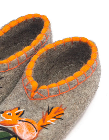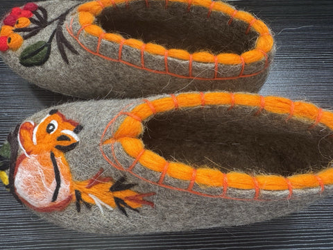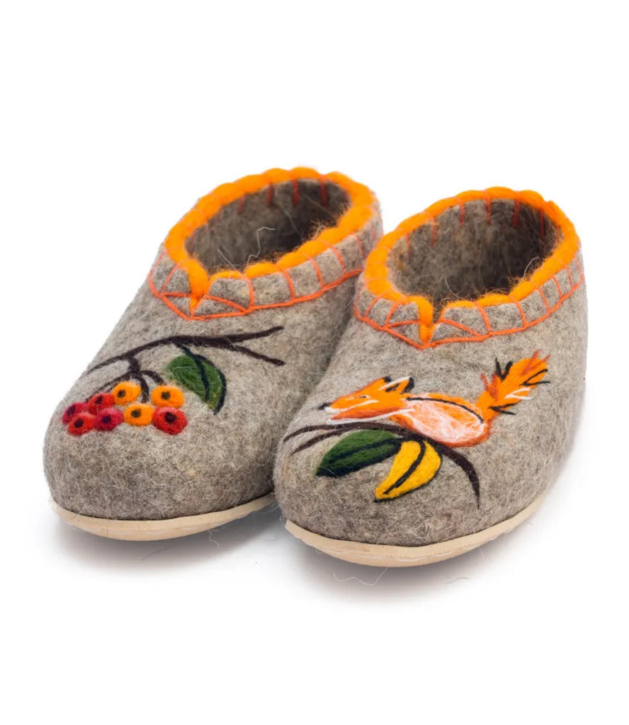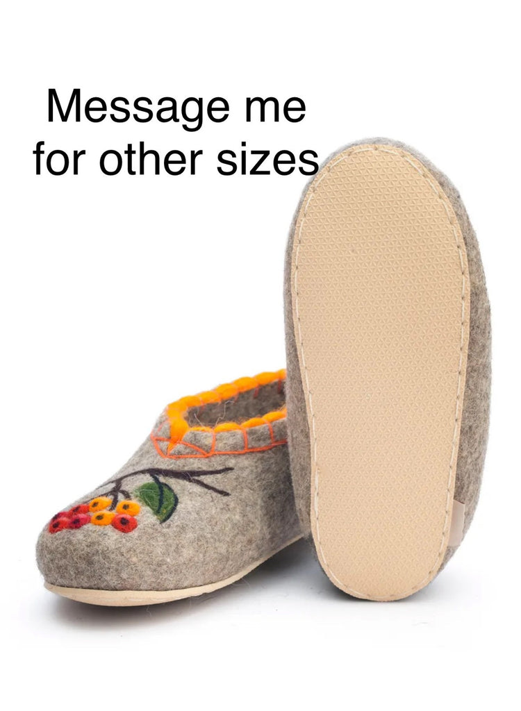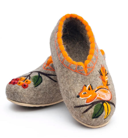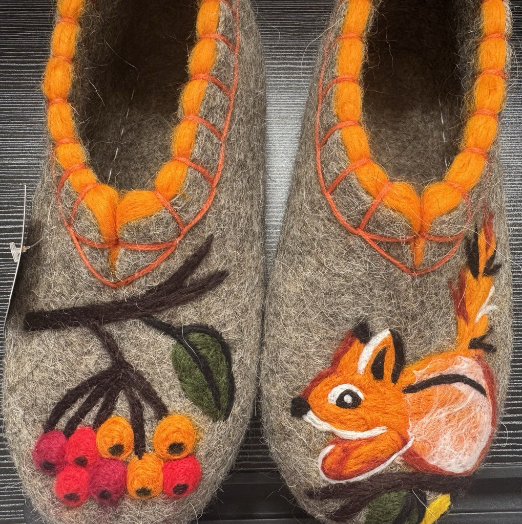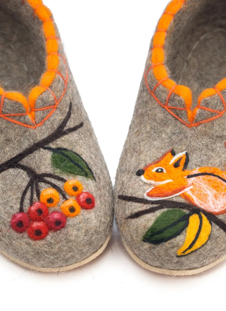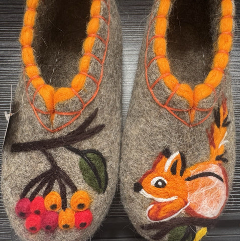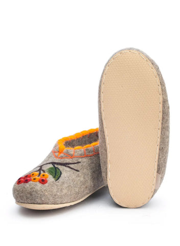 These are handmade slip-on slippers made from natural sheep wool felt, featuring embroidered squirrel and rowan designs. The wool fabric provides warmth and comfort, suitable for winter, fall, and spring seasons. With a flat heel height, microporous rubber outsole, and a shaft height of 7.5 cm, these gray slippers are designed for casual wear. The slipper's wool lining and insole offer additional insulation, making them a cozy choice for indoor use. Perfect for women who appreciate nature-inspired themes and natural materials, these Slavenki slippers have a slightly wider than average fitting for added comfort. These felted slippers provide dry warmth that