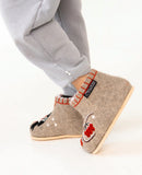 These slippers are made from 100% natural wool felt, featuring a gray color with embroidered bullfinch and red rowan pattern. Handmade in the Russian Federation by Nashi Valenki, they are designed for women in UK size 6, US size 39, and EU size 38. Perfect for winter, fall, summer and spring seasons, these cozy house shoes boast a nature-themed style with accents of red bullfinch and rowan embroidery, ideal for those who appreciate natural materials and artisan craftsmanship. Stay warm and