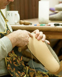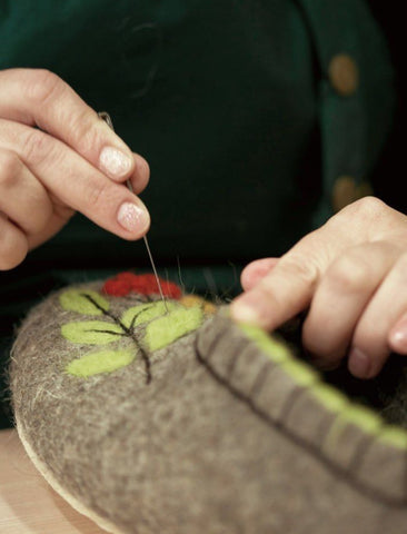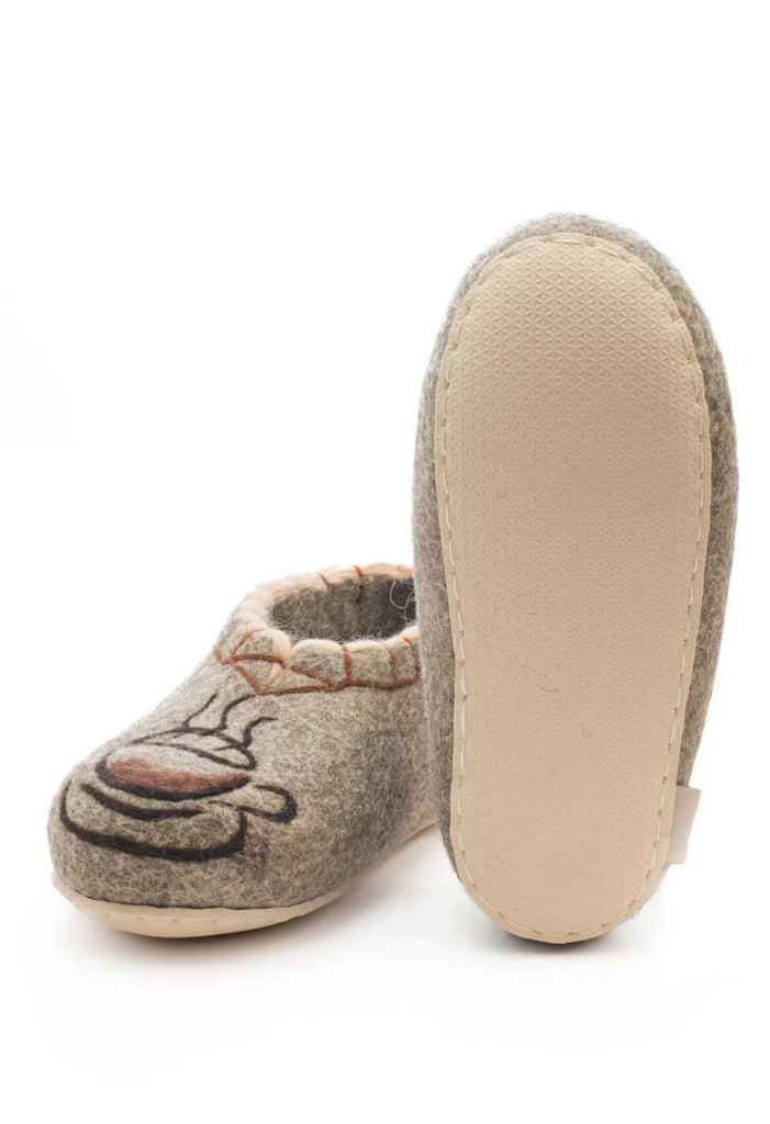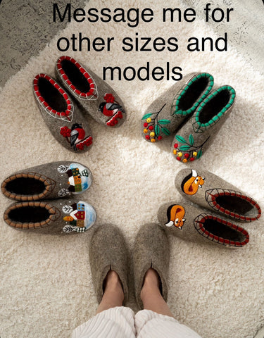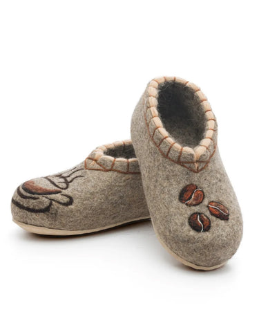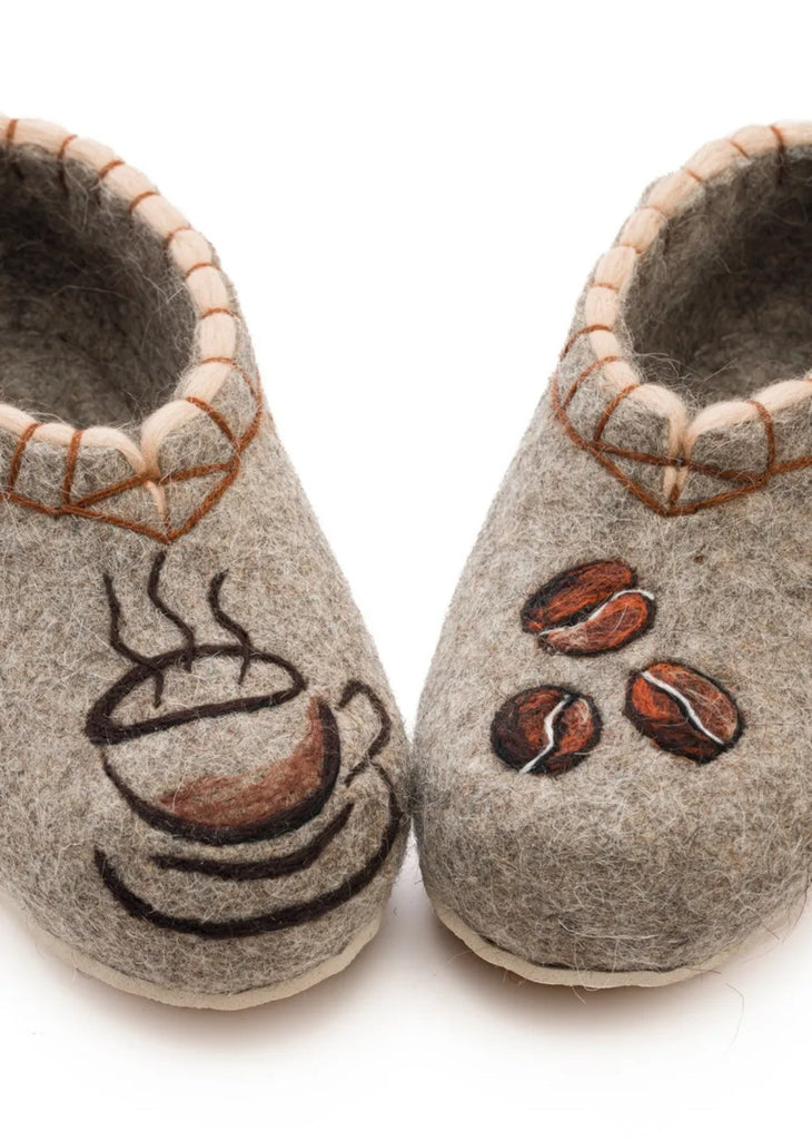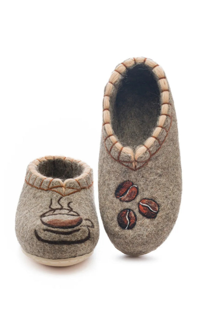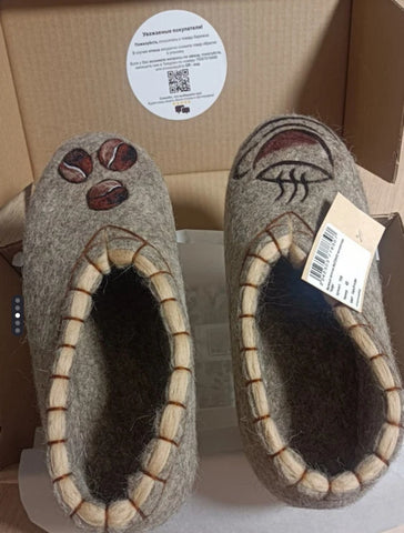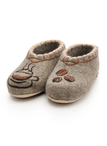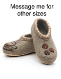 These slippers with coffee theme are handmade using natural sheep wool felt with wool embroidery of a coffee design. They have a flat design under and a slip-on style for casual wear during the winter, fall, spring and even summer seasons. The wool lining and insole provide comfort and warmth, while the microporous rubber outsole offers durability. These Slavenki slippers from Russia are 100% wool and feature a slightly wider than average fitting for UK shoe sizes 2 (US size 5, EU size 36). The natural wool of Russian house shoes "valenki" made of natural sheep wool soothe muscle and joint pain and relieve nervous tension, making them both stylish and beneficial for the wearer.
