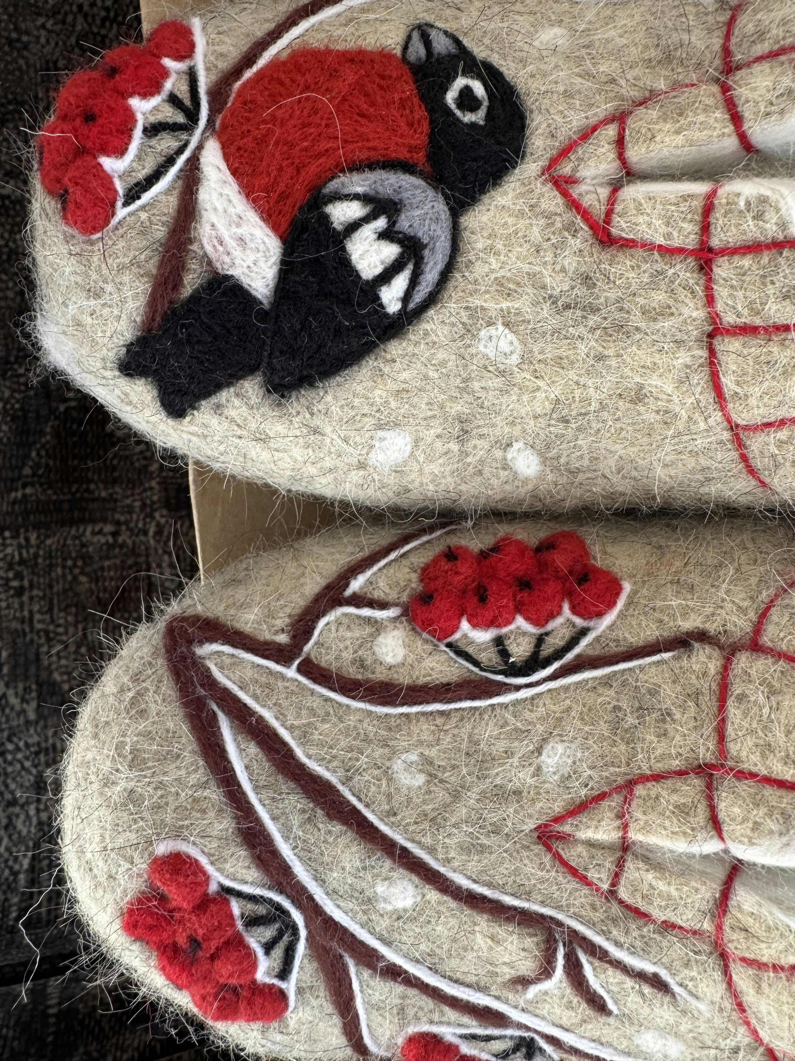 Wrap your feet in cozy comfort with these handwoven sheep slippers featuring playful rowan berry and bullfinch embroidery that captures the magic of winter. These charming chuni slippers boast a durable rubber outsole perfect for padding around your home on chilly days. The intricate embroidered details bring artistry to life, while the soft, warm construction keeps your toes toasty from morning to night. A delightful blend of traditional craftsmanship and winter warmth!