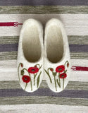 Wrap your feet in the cozy warmth of these felt wool slippers by WOOLE , perfect for anyone seeking comfort and a touch of Russian folk charm. The Chuni wide model features an embroidered poppy flowers pattern, bringing a burst of color to the classic milky white. These slip-ons are not just about looks; they're crafted with care, featuring a handwoven construction and a durable natural suede outsole for steady traction.