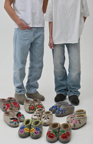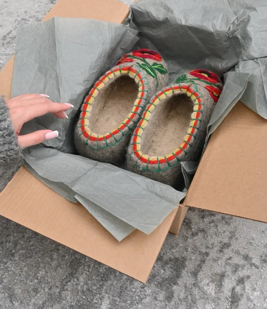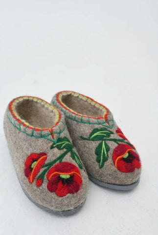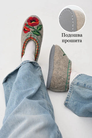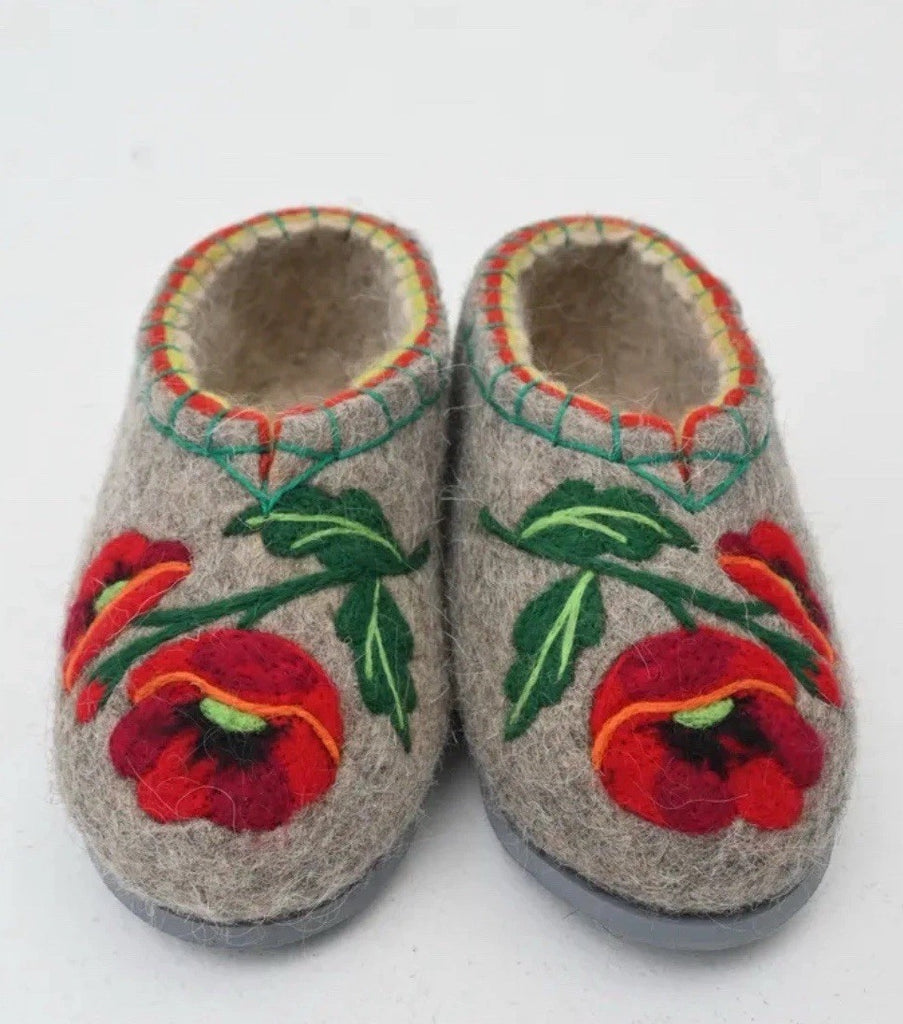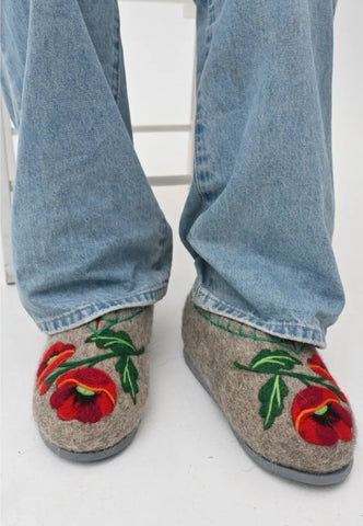 Wrap your feet in the cozy warmth of these felt wool slippers by MAYTAPKI, perfect for anyone seeking comfort and a touch of Russian folk charm. The Chuni wide model features an embroidered poppy flowers pattern, bringing a burst of color to the classic gray. These slip-ons are not just about looks; they're crafted with care, featuring a handwoven construction and a durable rubber outsole for steady traction.