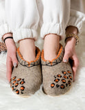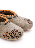 These Slippers by Slavenki are made from 100% Sheep Felt Wool, featuring a cozy wool lining and insole for comfort. The slip-on style boasts a leopard animal pattern with embroidered accents, making them a stylish and nature-themed choice. With a flat heel and microporous rubber outsole, these handmade Russian "valenki" woolen shoes are perfect for casual wear during the winter, summer, fall, or spring seasons. They offer medical benefits such as soothing muscle and joint pain while relieving nervous tension, making them a thoughtful and practical gift for a loved one. The sole is made of microporous rubber, which prevents slipping and increases the wear resistance of the slippers. It is not cold in the winter and not hot in the summer in these shoes, because the porous walls of these felt house shoes do not allow cold and heat to pass through, causing sufficient microcirculation to save the feet from overheating and not overcool them.