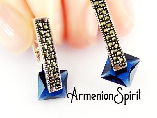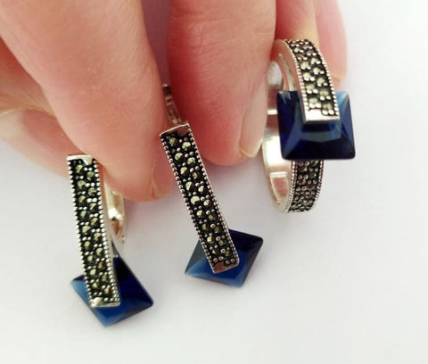 Expertly crafted by Armenian artisans, our Minimalist Modern Silver Jewelry Set is the perfect accessory for any occasion. Made with 925 Sterling Silver and adorned with sparkling navy blue zircon stones, this set includes small earrings and a matching ring for a complete and elegant look.