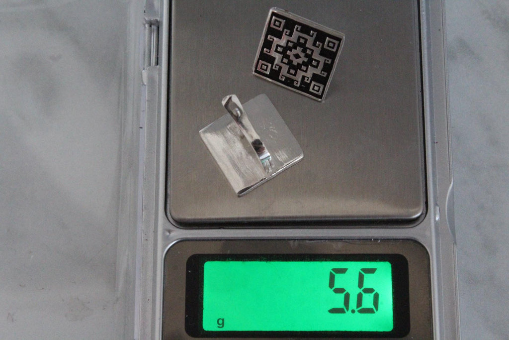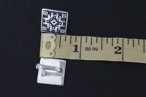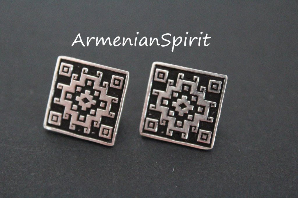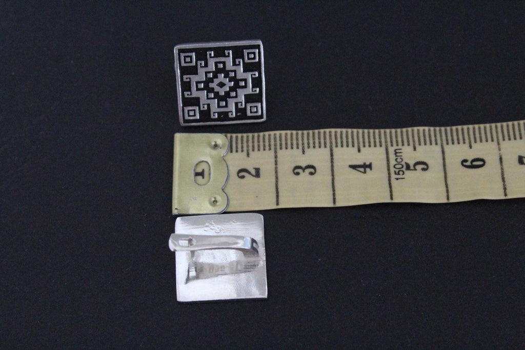 These small sterling silver earrings feature a beautiful Armenian carpet ornament, adding a touch of tradition to any outfit. The square shape and English lock provide a secure fit, while the silver and black color scheme adds a modern twist. Elevate your look with these high quality earrings.