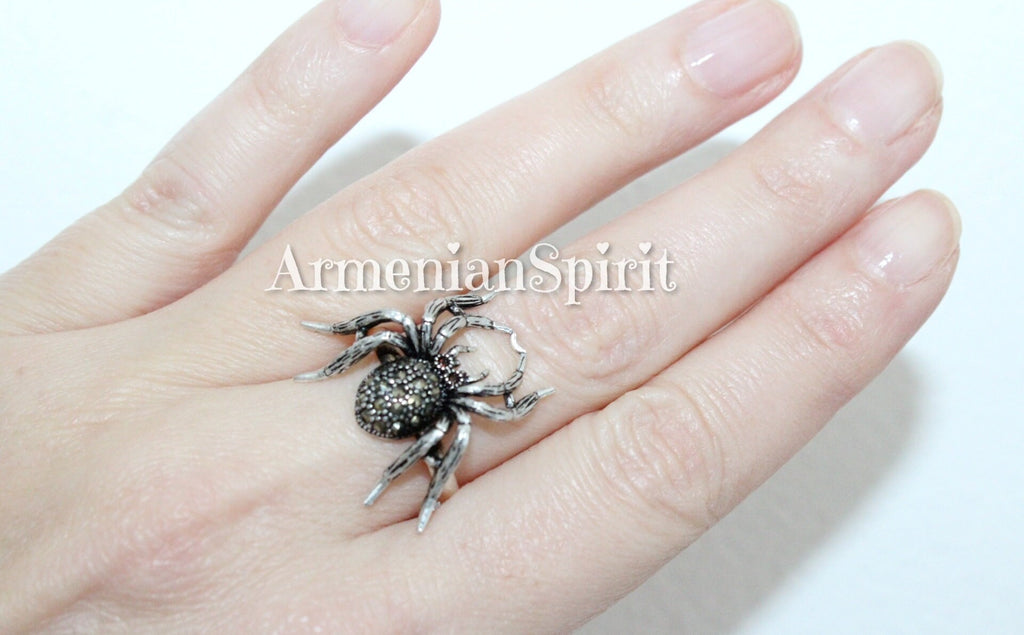 Do you like silver jewelry with insects? Love spider rings? So you will love this realistic spider ring. Women's ring is made of 925 sterling silver with marcasite. On the ring is a spider of medium size. The ring can be adjusted to fit your finger. But keep in mind that it is not suitable for very large sizes.