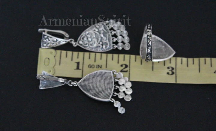 Expertly handcrafted from high quality sterling silver 925, these Armenian Spirit earrings feature beautiful chandelier designs and intricate Western Armenian ornaments. Their traditional style and elongated shape give off a Boho dangle, perfect for adding a touch of elegance to any outfit. Indulge in our exquisite jewelry collection, perfect for even the most sensitive skin! With hypoallergenic materials and free shipping worldwide, it's no wonder why we're rated 5 stars. Trust us to provide the best online jewelry store experience, offering affordable prices for the perfect gift for your beloved woman.