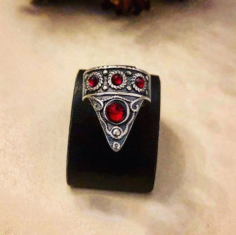 Do you like unusual and 925 sterling silver jewelry? Do you want jewelry to be at a reasonable price and not expensive? Pay attention to these precious metal thumb rings that any woman can afford. These rings are also suitable for a gift to your beloved wife, girlfriend, mother. The ring consists of 4 lab red quartz stones. We also make the same ring with light blue stones. The ring has a shape of triangle. Material is sterling silver 925. These women rings have beautiful Armenian patterns and ornaments. You can wear the ring on your thumb or even on other fingers it will look stunning. The ring can be adjusted according to your size. This silver jewelry will be a great addition for those who love boho style. The ring is also suitable for everyday wear with any clothes.