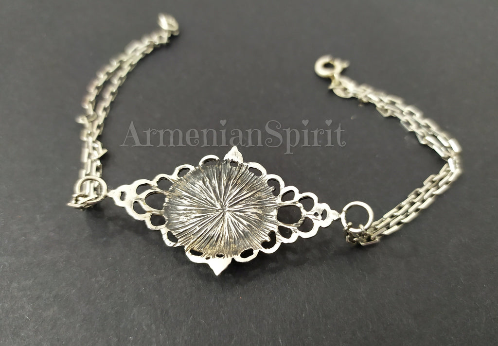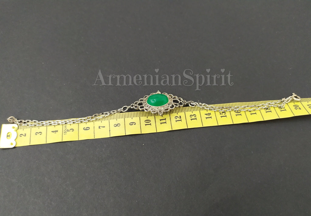 Expertly crafted with sterling silver 925, this bracelet features two chains and a green natural cabochon jadeite. Elevate your jewelry game with this stylish and unique piece from one of the best online stores for jewelry. Add a touch of elegance and sophistication to any outfit with this one-of-a-kind bracelet.