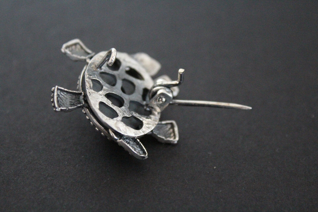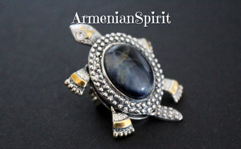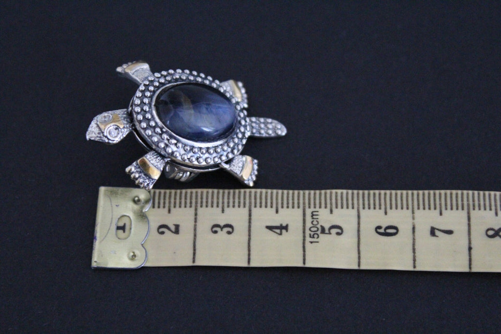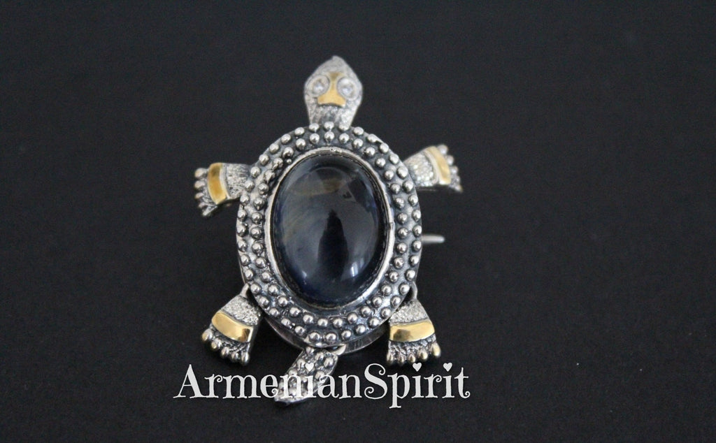 Add a touch of vintage charm to your outfit with our tortoise brooch from our high-quality Armenian Etsy store. Made with 925 stamped sterling silver and a large Labradorite blue gem, it's the perfect gift for any turtle lover. Complete your retro look with this unique and stylish brooch. The turtle`s legs, head and tail are moving. Find beautiful and hypoallergenic jewelry for all occasions at our Etsy store. With worldwide shipping and sensitive skin-friendly materials, we've got you covered wherever you go. Shop now and experience the best of the best.