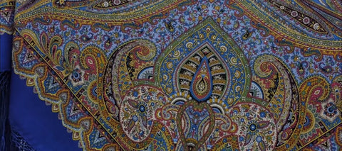 A stunning 58-inch, 100% merino wool shawl showcasing traditional Russian floral and herbal patterns. Featuring a bold contrast of blue framing the sides and a white background at the center, it is adorned with intricate burgundy and yellow herbal-inspired designs, adding depth and elegance. Soft, warm yet lightweight, this high-quality shawl drapes beautifully and feels incredibly comfortable against the skin. Finished with delicate silk fringes, it adds a refined touch of heritage craftsmanship. Expertly made by the renowned Pavlovo Posad manufacturing, this exquisite piece is a timeless statement accessory, perfect for any season and occasion.