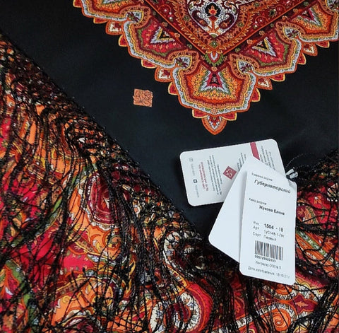 A stunning 58-inch, 100% merino wool shawl showcasing traditional Russian floral and herbal patterns. Featuring a bold contrast of deep black framing the corners and a red at the center, it is adorned with intricate burgundy and yellow herbal-inspired designs, adding depth and elegance. Soft, warm yet lightweight, this high-quality shawl drapes beautifully and feels incredibly comfortable against the skin. Finished with delicate silk fringes, it adds a refined touch of heritage craftsmanship. Expertly made by the renowned Pavlovo Posad manufacturing, this exquisite piece is a timeless statement accessory, perfect for any season and occasion.