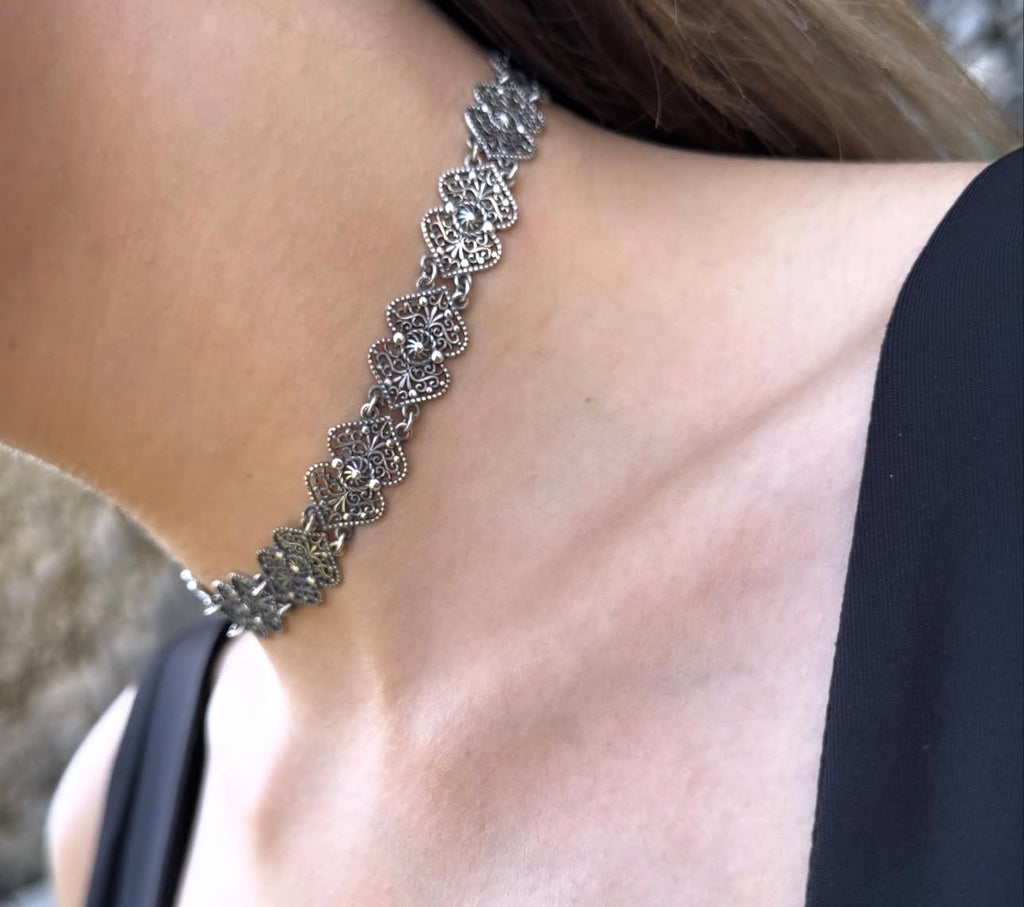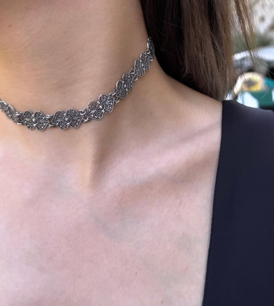 Handcrafted sterling silver 925 choker featuring intricate Armenian filigree detailing—a timeless ethnic design rooted in centuries of artisan tradition. This snug-collar piece combines heritage craftsmanship with modern wearability, available in multiple lengths with adjustable links to ensure a perfect fit for every neck. Each choker is meticulously created by Armenian artisans who carry forward generations of jewelry-making expertise, blending delicate filigree patterns with the durability of premium sterling silver. A statement piece that honors cultural legacy while delivering everyday elegance.