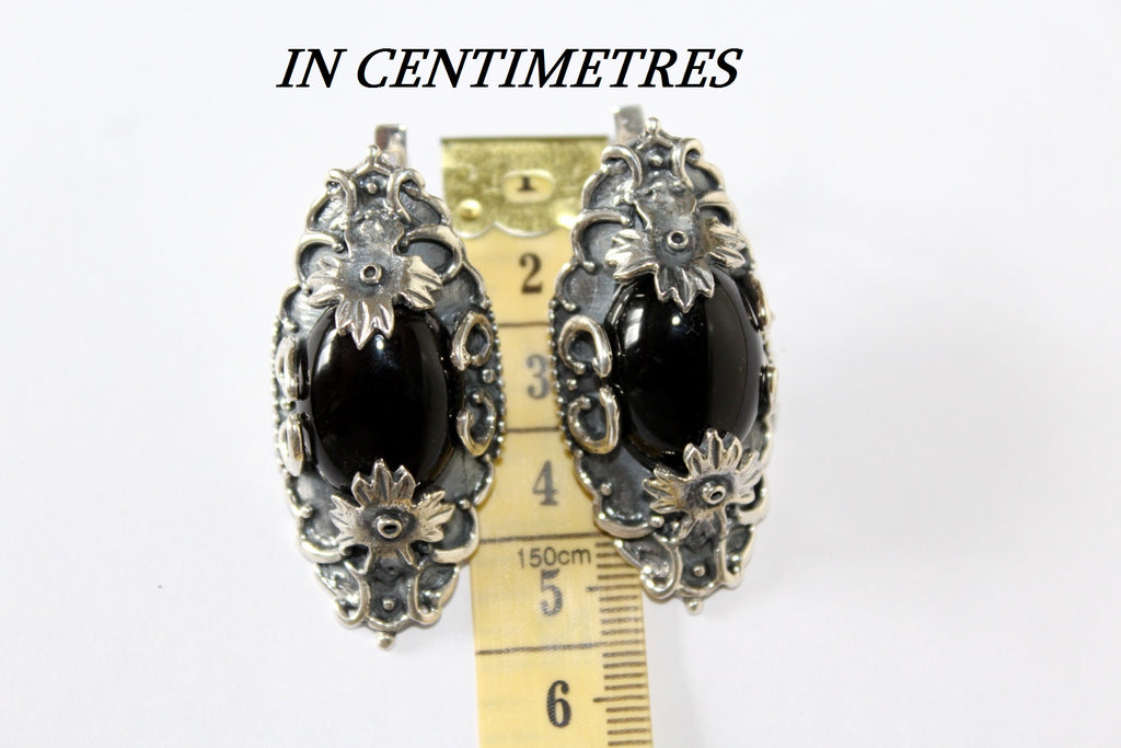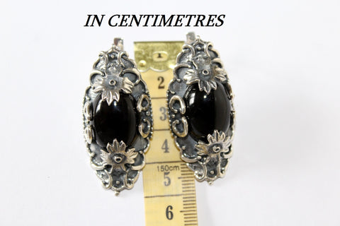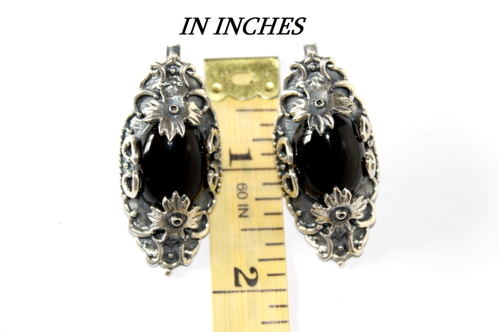 Introducing our very big earrings made with 925 stamped high quality silver. Handcrafted with unique black onyx stones, these vintage style earrings are a statement piece for any outfit. Elevate your style with this stunning floral jewelry, perfect for women who appreciate vintage inspired quality and beauty.