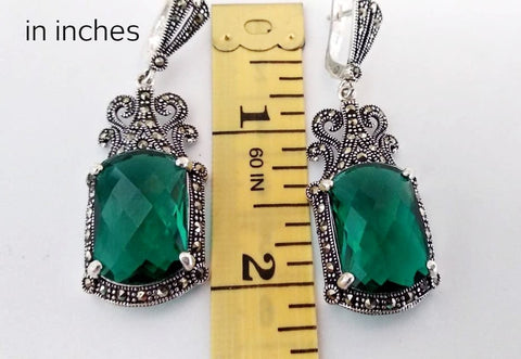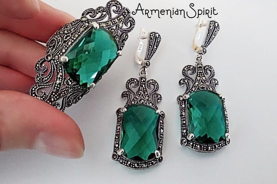 Add a touch of elegance with this luxurious Jewelry set. Crafted with high quality sterling silver 925, each piece is hypoallergenic, perfect for sensitive skin. The set includes a stunning emerald green Marcasite ring and matching earrings, reminiscent of Victorian and Tudor jewels from Armenia. Elevate your style with this sophisticated and exclusive set. Pay with Paypal, Mastercard or Visa card.