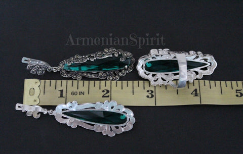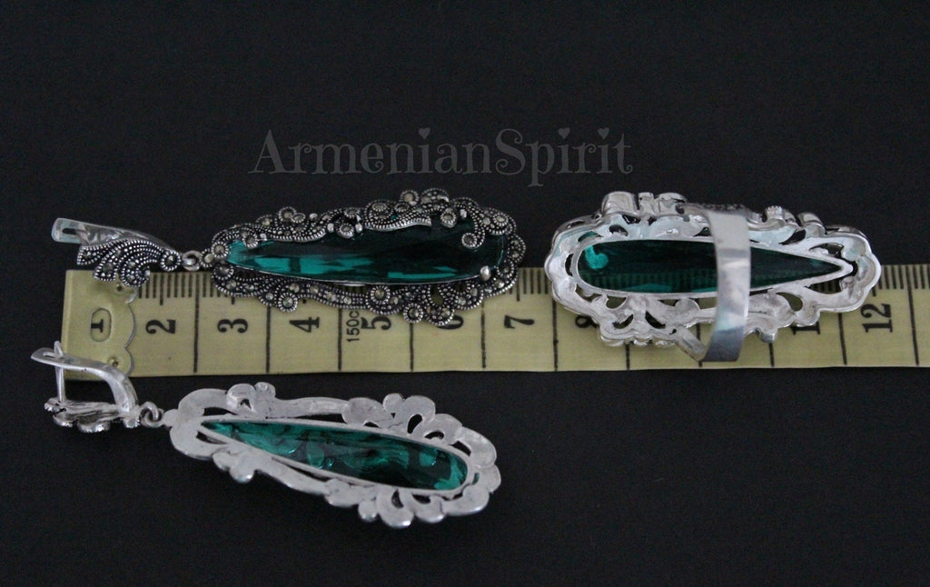 Upgrade your earring collection with our silver 925 marcasite extra long earrings in emerald green topaz. These large, very long earrings are handmade in Armenia, ensuring high quality and unique design. Perfect for adding a touch of elegance to any outfit. The perfect accessory to elevate any look, they make great gifts for that special woman in your life. Match them with an emerald green or black dress for a truly elegant and sophisticated touch. Shop now on also on ebay Armenian Spirit for high quality, timeless style.