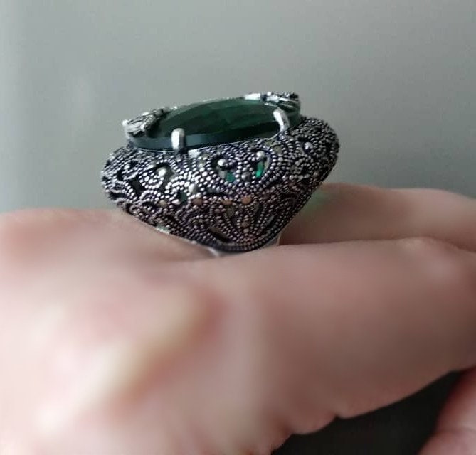 This elegant, extra large ring is the perfect addition to any luxury party attire. Crafted from sterling silver, it features a stunning green emerald and sparkling marcasite stones. The oversized design adds a touch of mid-century vintage charm. Elevate your style with this beautiful ring from Tudor.